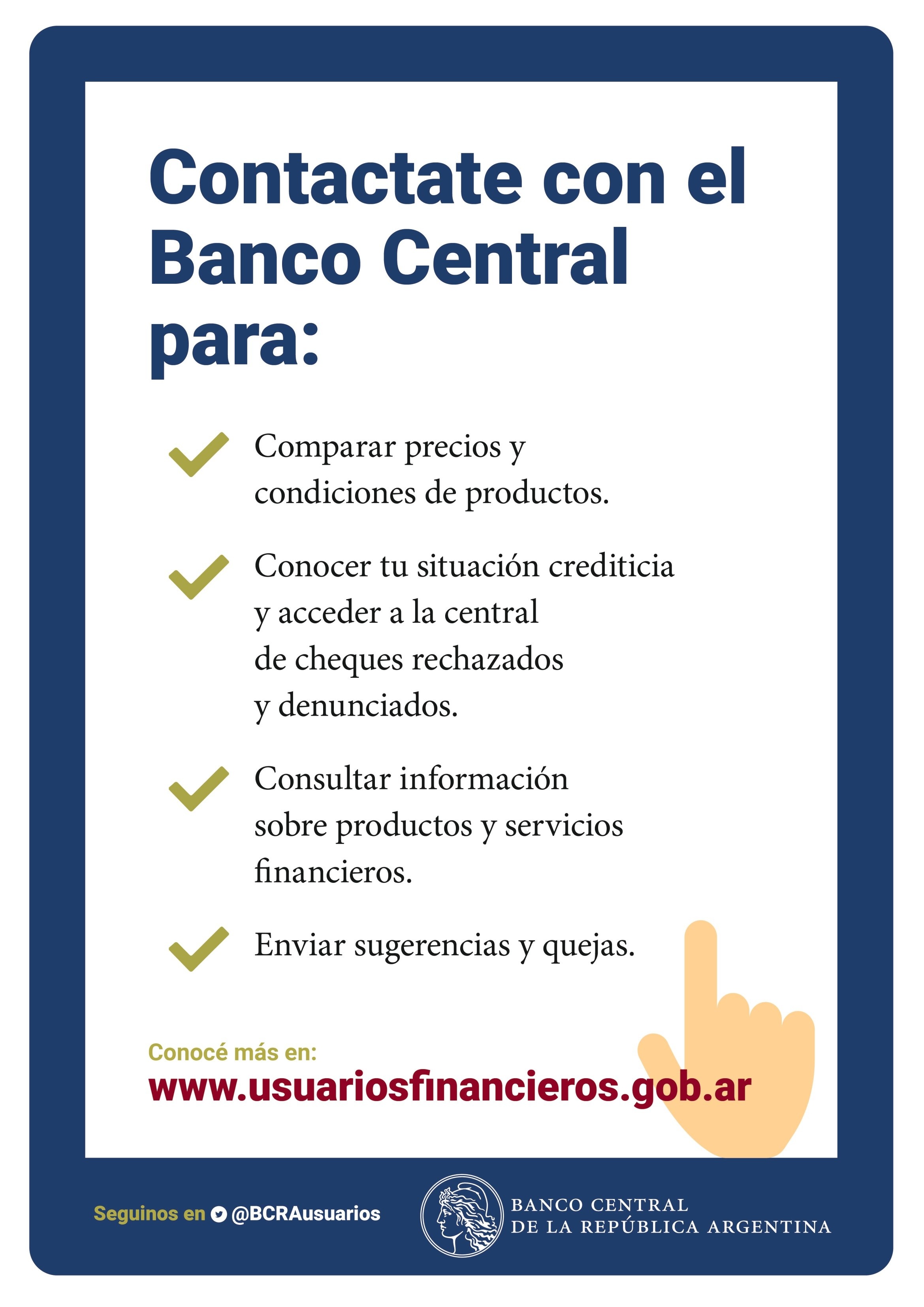 BCRA dispone de un área de Protección al Usuario de Servicios Financieros que se podrá contactar ingresando a https://www.bcra.gob.ar/BCRAyVos/Usuarios_Financieros.asp