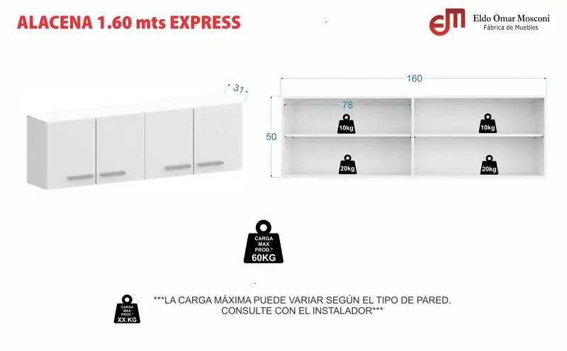 ALACENA EXPRESS 1,60 mts. ESPECIFICACIONES:* Colores: Blanco- Blanco con frente Chocolate * Medidas: 160x31x50 cm.* Material: melamina sobre MDP 15 mm.* Interior del mueble y fondo blanco.* Manijas plásticas color gris que pueden colocarse de manera HORIZONTAL o VERTICAL.* PESO MÁXIMO SOPORTADO: 40 kg.* Marca: Mosconi PACKAGING: 1 BULTO Medidas: 175x62x8 cm.- Peso: 30 kg.
