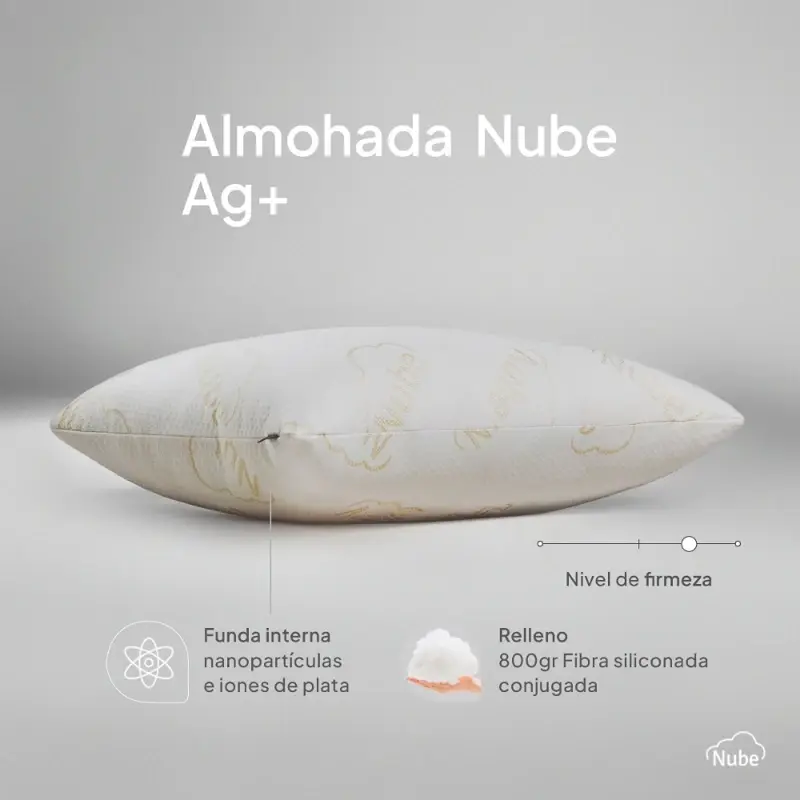 DESCUBRI COMO FUNCIONA LA TECNOLOGIA DE IONES DE PLATA QUE TE CUIDARA A VOS Y A TU FAMILIALa almohada NUBE AG+ posee en su interior nano-partículas de plata que liberan iones de plata. Esta tecnología llega para dar respuesta a la búsqueda constante de otorgar beneficios y bienestar a sus usuarios.La nanotecnología es la manipulación de la materia a escala nanométrica. Es capaz de alterar los procesos biológicos de los microorganismos. La liberación de los IONES DE PLATA elimina e impiden el desarrollo de hongos, virus y bacterias. Funda exterior: Tela de jackard texturizadoFunda interior: Fiselina con nanotecnología de iones de plataRelleno: Fibras vírgenesMedidas: 50cm x 70cmLas imagenes son ilustrativas. El diseño de la tela puede variar.