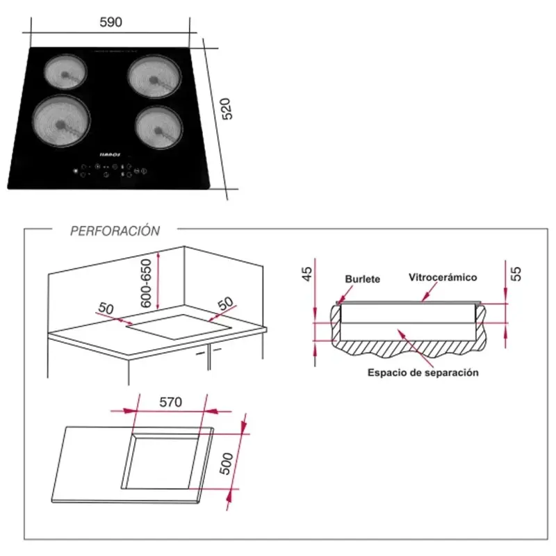 Bloqueo de seguridad contra encendido accidental.Indicador digital individual de potencia en cada quemador.Alerta de superficie caliente aún después de apagado.Hornallas de calentamiento rápido.9 niveles de potencia.Control touch.Timer programable.