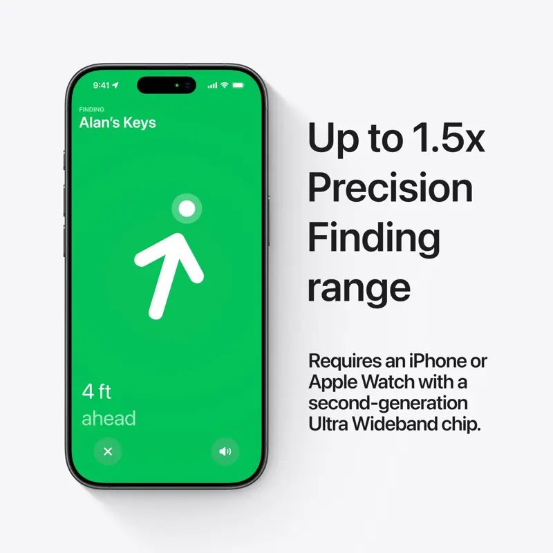 - Búsqueda de precisión mejorada con hasta 1.5 veces mayor alcance en modelos compatibles de iPhone y Apple Watch.