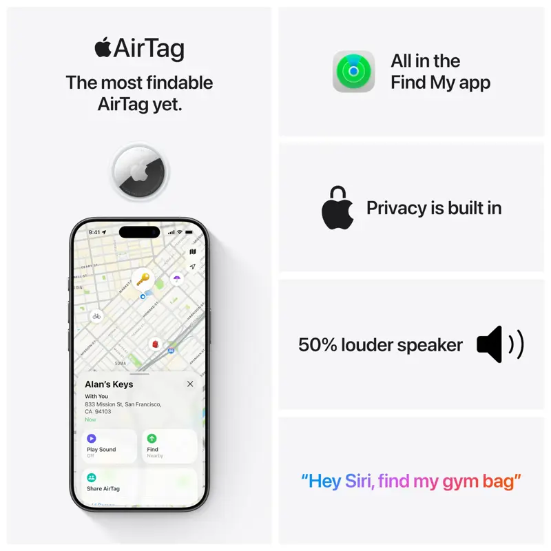 - Seguridad: Los datos y el historial de ubicación nunca se almacenan en el AirTag; solo usuarios autorizados pueden acceder a la ubicación