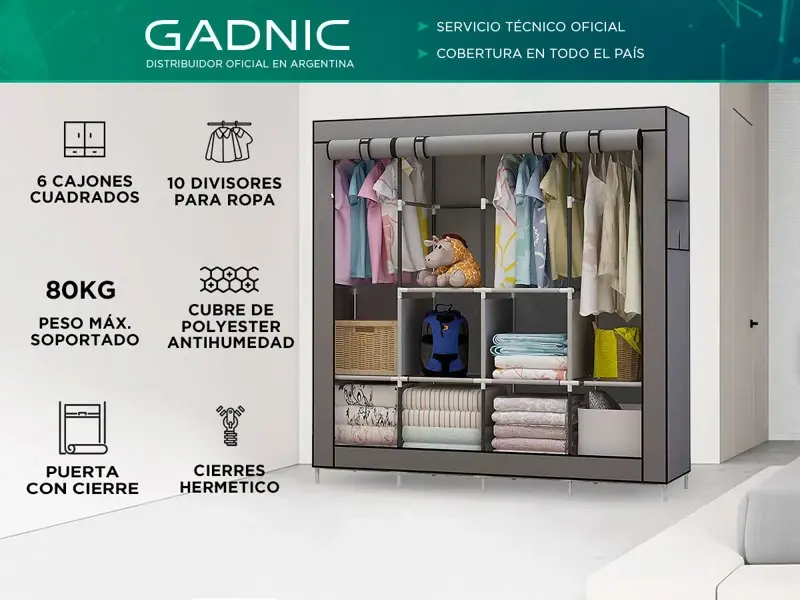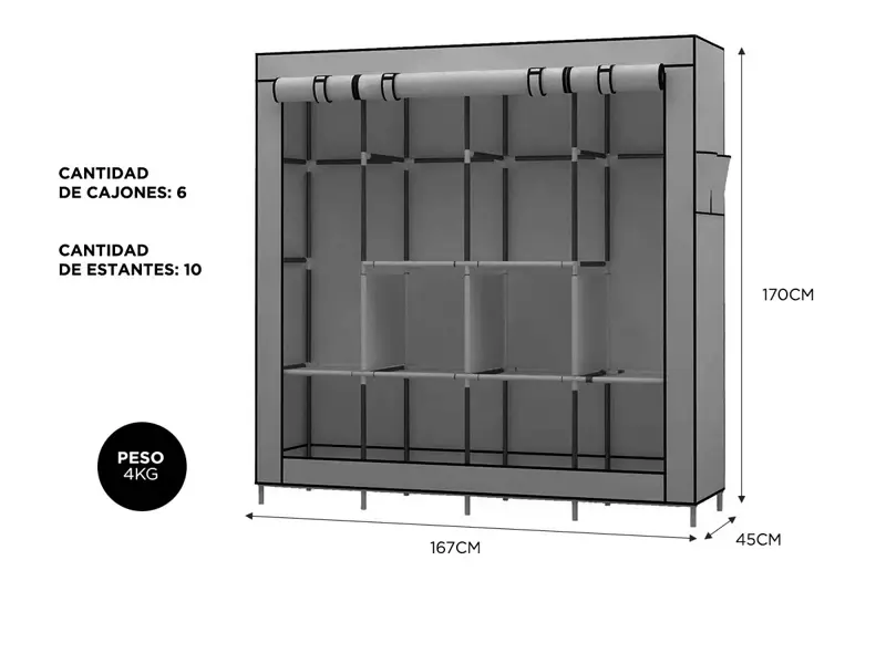 ¡Descubre el Armario Armable Grande Gadnic! Con este práctico y espacioso closet, podrás mantener tu vestuario ordenado y al alcance de tu mano. Diseñado para adaptarse a tus necesidades de almacenamiento, este ropero armable te brinda la solución ideal para maximizar el espacio en tu hogar. Construido con materiales de alta calidad, este ropero ofrece resistencia y durabilidad. Su diseño armable te permite montarlo de manera rápida y sencilla, sin necesidad de herramientas complicadas. Podrás tener tu nuevo closet listo en pocos minutos, ahorrando tiempo y esfuerzo. El armario Gadnic cuenta con un amplio espacio de almacenamiento para colgar prendas de vestir, así como estantes para organizar tus zapatos, bolsos y accesorios. Su diseño inteligente te permite maximizar el uso del espacio, manteniendo todo ordenado y al alcance de tu mano. Olvídate de las prendas amontonadas y los zapatos desordenados, con este closet todo estará en su lugar. Además de su funcionalidad, este ropero armable tiene un diseño moderno y elegante que se adapta a cualquier estilo de decoración. Su color neutro combina fácilmente con el resto de tus muebles y su estructura robusta garantiza su estabilidad a lo largo del tiempo. No importa si tienes un dormitorio pequeño, un apartamento o una casa grande, este Ropero Armable Grande se ajusta a tus necesidades. Su versatilidad y capacidad de adaptación te permiten ubicarlo en cualquier espacio disponible. ¡Incluso puedes llevarlo contigo si te mudas! Es la solución perfecta para organizar tu ropa y zapatos de manera eficiente y elegante. Con su diseño armable, amplio espacio de almacenamiento y resistencia, este closet se convierte en el complemento ideal para tu hogar. ¡No pierdas la oportunidad de tener un vestuario ordenado y funcional, adquiere ya este práctico ropero armable! Especificaciones Material: tela + hierro + ABS Tamaño del producto: 167 x 45 x 170cm Peso: 4 kg Cantidad de cajones: 6 Cantidad de estantes: 10 Armable: Sí Organiza: ropa, zapatos y accesorios Divisiones: 10 secciones internas para organizar tu ropa. Peso máximo: Soporta hasta 80 kg. Característica: Fácil de colocar Diseño: Moderno, Bonito y practico