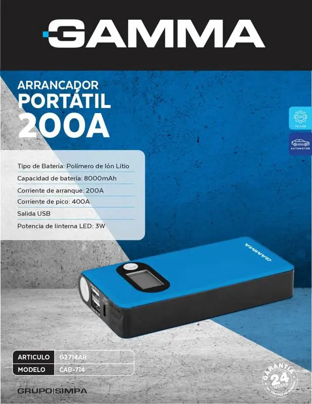 El arrancador portátil G2714AR CAB-714 es una solución eficiente y compacta para emergencias vehiculares. Diseñado con una batería de polímero de ión litio de 8000mAh, proporciona una corriente de arranque de 200A y un pico de 400A, capaz de encender motores a gasolina de hasta 3 litros más de 30 veces con una carga completa.Este dispositivo multifuncional incluye dos puertos USB (5V/1A y 5V/2A) para cargar dispositivos electrónicos, una salida de 12V (máximo 10A) y una linterna LED de 3W para emergencias nocturnas. Operativo en temperaturas extremas (-30 a 50°C) y diseñado con medidas de seguridad avanzadas como protección contra chispas, polaridad inversa, cortocircuitos y bajo voltaje.El CAB-714 es compacto, confiable y versátil, siendo el aliado perfecto tanto para arrancar vehículos como para mantener tus dispositivos cargados en cualquier situación. Ideal para uso personal y profesional.