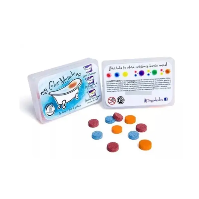 contiene 18 pastillas en 3 colores que se pueden mezclar entre si.Color Mojado: pastillas, con un toque de efervescencia, que dan color al agua de la bañadera, vienen en los tres colores primarios (rojo, azul y amarillo), que al mezclarlos dan como resultado los colores secundarios (verde, violeta y naranja).Cada pastilla rinde para una bañera grande, para una infantil con media pastilla alcanza. Vivos colores Súper divertido sobre todo si no son muy amigos del baño.Recomendado a partir de 3 años