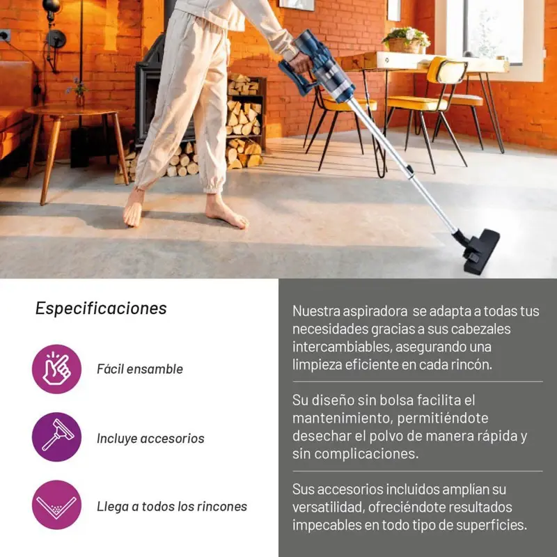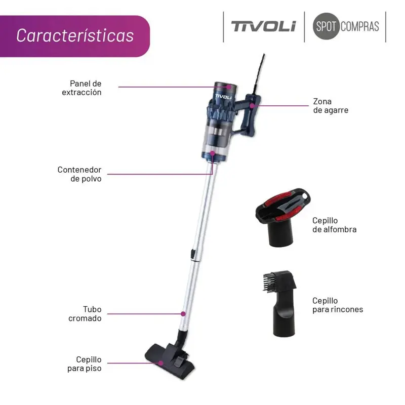 Aspiradora De Mano Vertical 2 En 1 Tivoli 800w AST-180.Nuestra aspiradora se adapta a todas tus necesidades gracias a sus cabezales intercambiables, asegurando una limpieza eficiente en cada rincón.Su diseño sin bolsa facilita el mantenimiento, permitiéndote desechar el polvo de manera rápida y sin complicaciones.Sus accesorios incluidos amplían su versatilidad, ofreciéndote resultados impecables en todo tipo de superficies.Especificaciones:* Marca: Tivoli.* Tipo: Aspiradora 2 en 1.* Medidas: 1,1m x 2,33m.* Capacidad: 1 litro.* Fácil ensamble.* Llega a todos los rincones.* Incluye: 1 unidad.