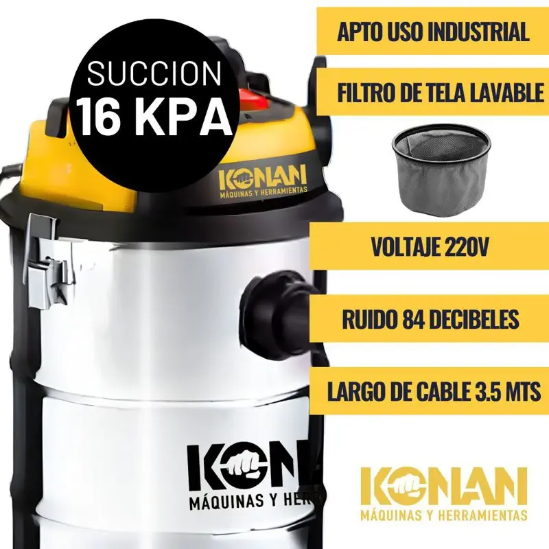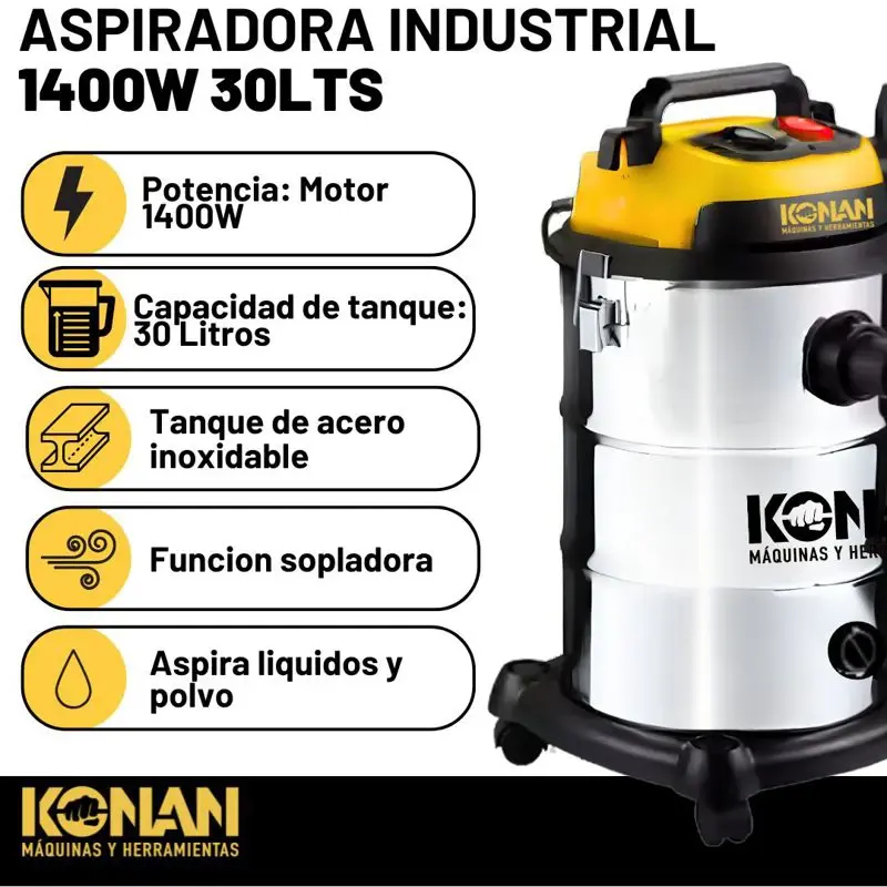 La Aspiradora Industrial Konan 1400W de 30 Litros es la herramienta ideal para trabajos de limpieza exigentes, tanto en entornos industriales como domésticos. Diseñada con un potente motor de 1400W, esta aspiradora ofrece una gran capacidad de succión para eliminar eficazmente polvo, suciedad y líquidos.