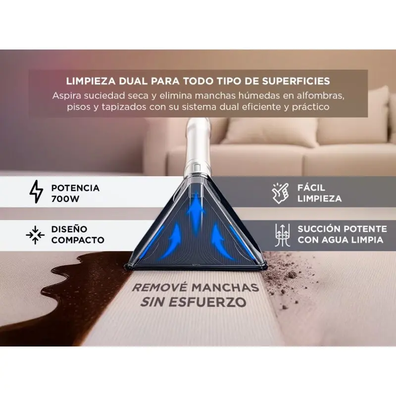 El sistema de rociado y succión de la aspiradora GADNIC elimina manchas difíciles en tapizados, alfombras y sillones, ofreciendo resultados visibles desde el primer uso.
