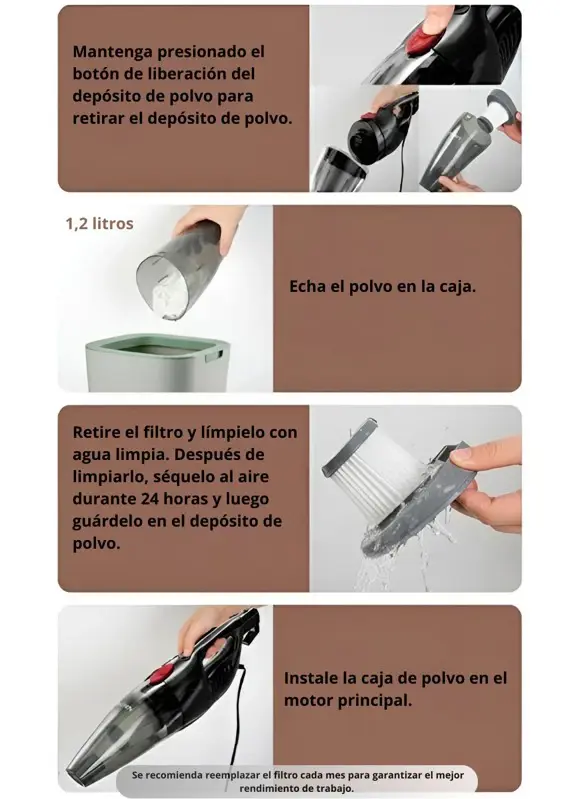 El paquete incluye: Motor principal, Barra de mano, Cabezal de cepillo para piso, Cabezal de succión plano, Manual del usuario