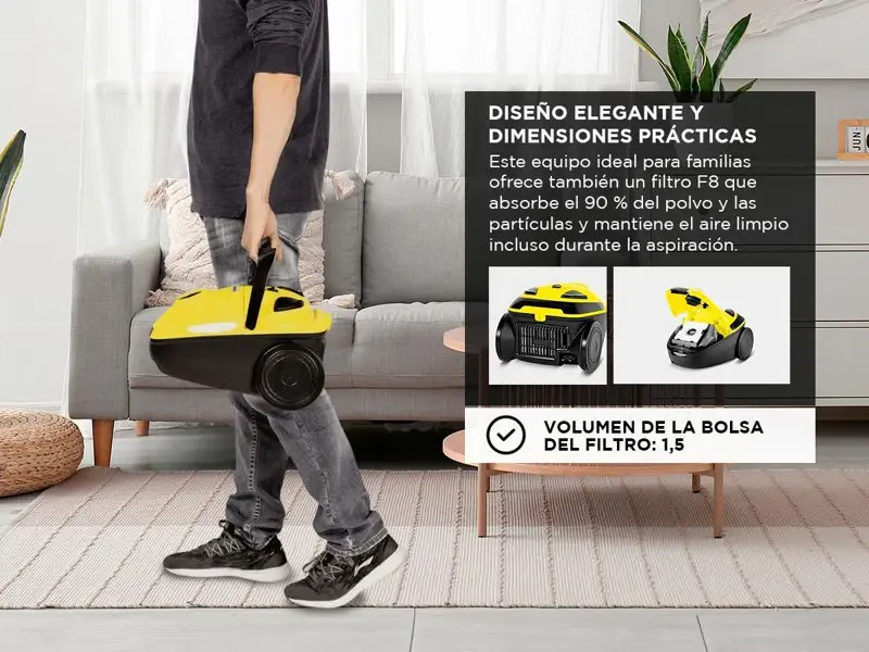 Como en todos los equipos Kärcher, en el VC 1 la funcionalidad es la máxima prioridad. Esta aspiradora eficaz y ecológica limpia suelos y alfombras sin esfuerzo. Además puede usarse en huecos estrechos, esquinas, bordes y otros puntos de difícil acceso. Su cómodo sistema de bolsas de filtro simplifica la eliminación de bolsas enteras, y gracias al práctico almacenaje de accesorios, siempre impera el orden. De diseño elegante y de prácticas dimensiones, la aspiradora resulta perfecta para los hogares modernos. Este equipo ideal para familias ofrece también un filtro F8 que absorbe el 90 % del polvo y las partículas y mantiene el aire limpio incluso durante la aspiración.EspecificacionesLimpiadora AspiradoraTipo: Aspiradora con bolsaPotencia absorbida (W): 1000Radio de acción (m): 7,5Volumen de la bolsa del filtro (l): 1,5Intensidad acústica (dB/A): 85Tipo de corriente (V/Hz): 220 - 240 / 50 - 60