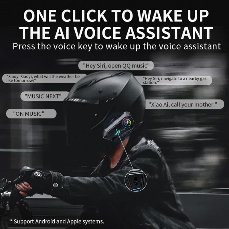 Auriculares Bluetooth para motocicleta con diseño resistente al agua IPX6, ideales para cascos integrales y de media cara. Compatibles con asistentes de voz, permiten la conexión simultánea de dos teléfonos, facilitando el cambio entre dispositivos para llamadas y música. Con botón físico para un uso sencillo incluso con guantes. Batería de litio integrada de 3,7 V y 2000 mAh, ofreciendo hasta 30 horas de llamadas y 25 horas de reproducción. Tecnología Bluetooth 5.3, distancia de transmisión de 20 metros. Incluye auricular, base, micrófono, cable de carga, manual y kit de instalación. Peso total: 180 g.