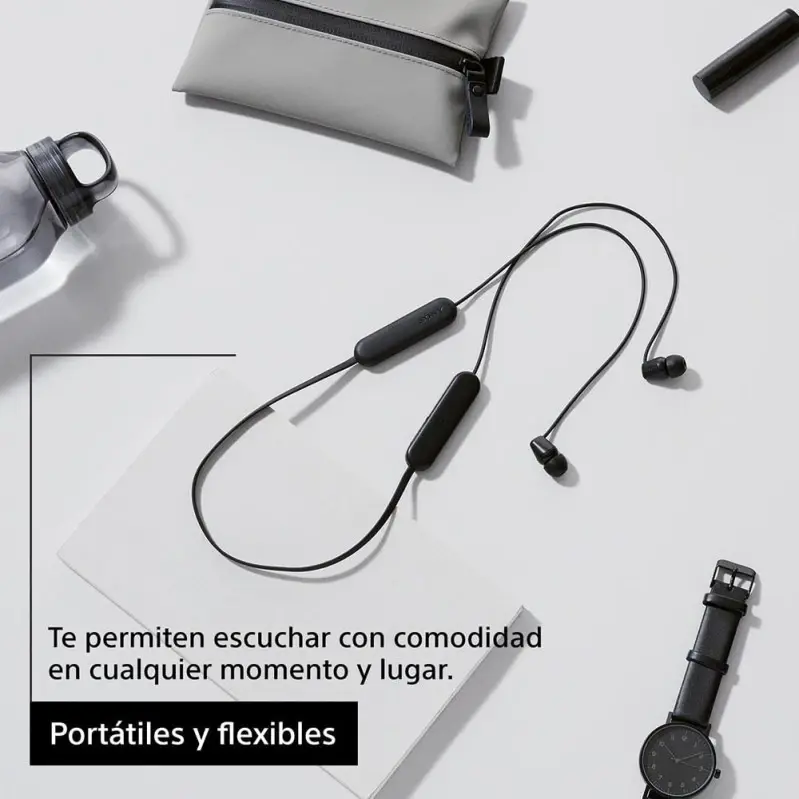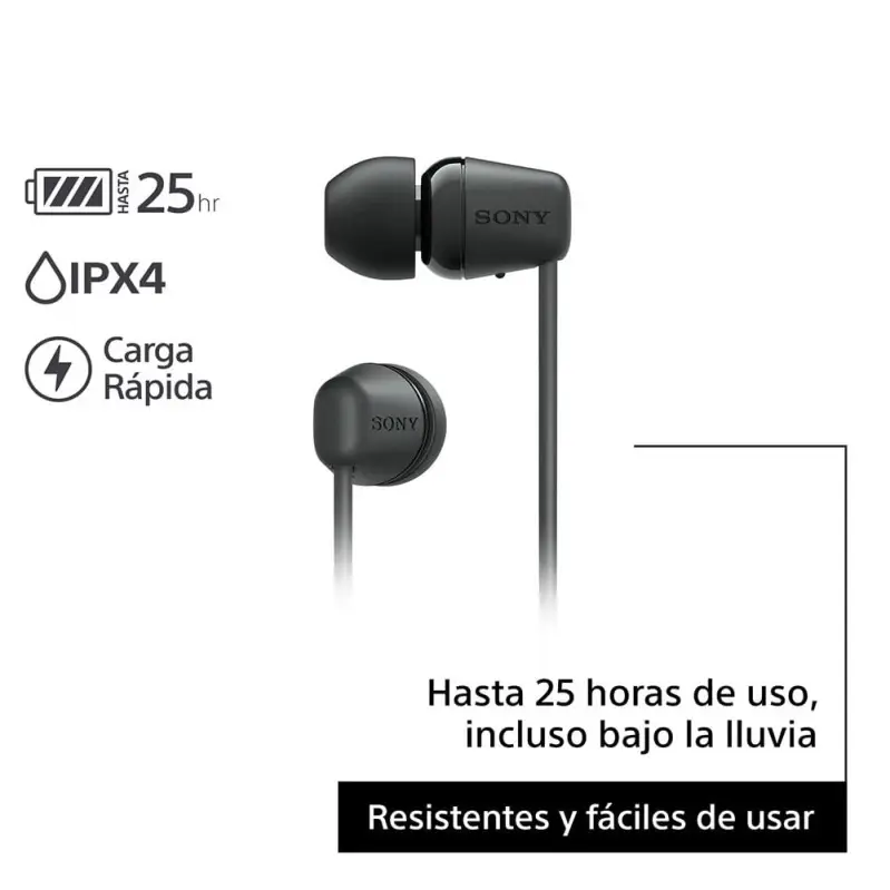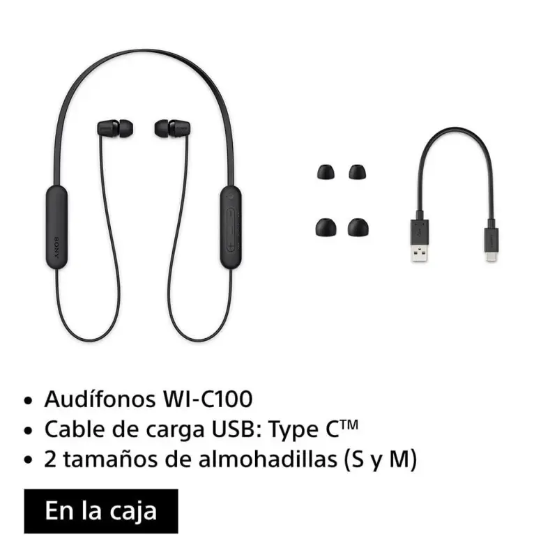 - 20 000 Hz (Frecuencia de muestreo de 44,1 kHz) » Control de volumen: Sí » Estilo de uso: Auriculares internos » Resistente al agua: IPX4 » NFC: No » DSEE: Sí » Tiempo de carga de batería: Aprox. 3 horas » Método de carga de batería: USB » Duración de la batería (tiempo de reproducción de música continua): Hasta 25 h » DURACIÓN DE LA BATERÍA (TIEMPO DE COMUNICACIÓN CONTINUA): Hasta 15 h » Versión de Bluetooth®: Versión 5.0 » Alcance efectivo: Alcance aprox. de 30 pies » Rango de frecuencia: Banda de 2,4 GHz (2,4000 GHz-2,4835 GHz) » Perfil: A2DP, AVRCP, HFP, HSP » Formatos de audio compatibles: SBC, AAC » Protección de contenido compatible: SCMS-T Equipadas con innumerables funcionesLos auriculares internos inalámbricos WI-C100 ofrecen excelentes prestaciones, como una batería de larga duración, sonido de alta calidad, un diseño a prueba de salpicaduras y compatibilidad con la aplicación Sony | Headphones Connect. Larga duración de batería de hasta 25 hDisfruta hasta 25 horas de música sin interrupciones. Y si los auriculares tienen poca batería, una carga rápida de 10 minutos te dará hasta 60 minutos de tiempo reproducción. Haz que tu música suene más naturalCuando una fuente de música original está comprimida, pierde elementos de alta frecuencia que agregan detalle a una canción. Nuestro Digital Sound Enhancement Engine (DSEE) los restaura para producir un sonido de alta calidad cercano a la grabación original. [A] Restauración ][B] Restauración precisa del sonido] El sonido que a ti te gustaAdapta el sonido a tus preferencias. Elige entre diversos ajustes predeterminados adaptados al género de música que estés escuchando o crea y guarda los tuyos propios usando el ecualizador de la aplicación Sony | Headphones Connect. Sonido equilibradoTodo el rango de frecuencias está bien equilibrado, con voces claras y naturales. Por eso los WI-C100 son ideales para cualquier género de música. Sin problemas de salpicaduras y sudorGracias a su clasificación de resistencia al agua IPX41, ni las salpicaduras ni el sudor detendrán a estos auriculares, por lo que podrás seguir al ritmo de la música. Conectividad inalámbrica estableDespídete de las marañas de cables: con la tecnología Bluetooth®, podrás conectarte a tu dispositivo de forma inalámbrica y disfrutar de una reproducción estable y sin interrupciones. Llamadas nítidas con manos libresLa conversión fluye libremente en llamadas con manos libres nítidas gracias al micrófono integrado de alta calidad. No tendrás que sacar el teléfono del bolsillo. Se integran fácilmente en tu vidaLos auriculares WI-C100 son ligeros y portátiles, con una banda para el cuello flexible que facilita aún más su transporte en una mochila cuando te desplazas. Comodidad perfectaUna forma bien equilibrada alrededor del cuello garantiza un ajuste estable, mientras que los auriculares se adaptan al oído para ofrecer la máxima comodidad. Funcionamiento sencillo con botonesLos auriculares WI-C100 son fáciles de usar, con botones para reproducir y pausar la música, saltar de canción, controlar el volumen y responder llamadas. Los botones se diseñaron para ser más cómodos, con una forma pronunciada que los hace más fáciles de presionar. Compatibles con asistentes de vozAl presionar un botón, te conecta con el asistente de voz del smartphone para recibir indicaciones, reproducir música, hablar con contactos y mucho más.2 Encuentra tus auriculares con Fast PairFast Pair empareja los auriculares con dispositivos Android™. Con un toque de guía emergente, los WI-C100 permiten un emparejamiento Bluetooth® rápido y sencillo con dispositivos Android™. También puedes localizar fácilmente los auriculares haciéndolos sonar o comprobar su última ubicación registrada en la aplicación. Conéctate a tu PC con Swift PairSwift Pair empareja fácil y rápidamente tus WI-C100 con Windows 11 o Windows 10 por Bluetooth®. Al seleccionar el modo de emparejamiento, aparecerán instrucciones emergentes en los dispositivos cercanos con Windows 11 o Windows 10. Tan envolvente. Tan real.Sumérgete en tu sonido. Disfruta del sonido como en conciertos o con el artista en el estudio. Con 360 Reality Audio, la música nunca había sido tan envolvente ni realista. Disfruta con los auriculares de 360 Reality Audio.3Es necesaria la aplicación Sony 360 Spatial Sound PersonalizerCon Sony | 360 Spatial Sound Personalizer4Sony 5 Experiencia Dolby AtmosMediante un transmisor inalámbrico WLA-NS7 de Sony conectado a un televisor BRAVIA XR, tus auriculares pueden crear la distribución perfecta de parlantes virtuales a tu alrededor para proporcionarte una experiencia Dolby Atmos. Sumérgete en la escena y siéntete en el centro de la acción.6 Sostenibilidad como objetivoNuestros productos no solo son elegantes, también protegen el medioambiente. El plástico supone menos de un 5 % del material de embalaje individual de los WI-C100, lo que refleja el compromiso de Sony por reducir el impacto medioambiental de sus productos y prácticas.7