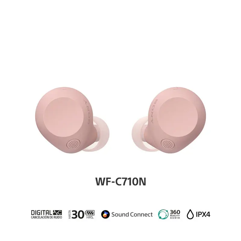 Sumérgete en el sonido con Noise CancellingLos micrófonos duales mejoran la función de Noise Cancelling de los WF-C710N al ayudar a detectar el ruido circundante y reducir la degradación del rendimiento debido a variaciones de ajuste individuales. Cambia al modo de sonido ambiental y disfrutarás de una experiencia de audio natural sin desconectarte del entorno.Tecnología de sensor de ruido con micrófonos dualesCon Noise Cancelling avanzado, los auriculares WF-C710N pueden aislarte del mundo que te rodea y permitirte disfrutar más de tu música. El sensor de ruido dual filtra el sonido exterior mediante dos micrófonos, por lo que lo único que escuchas es tu música.Silencia el vientoUna estructura de reducción de ruido del viento alrededor del micrófono reduce las distracciones cuando estás activo al aire libre y te permite concentrarte en tu música favorita.Sonido ambiente más natural y ajustableEn el modo de sonido ambiente, los auriculares WF-C710N captan mejor el sonido ambiente que te rodea gracias a los micrófonos de alimentación y retroalimentación, para que disfrutes de una experiencia de audio natural mientras mantienes la conexión con tu entorno. Además, la app Sony | Sound Connect te permite ajustar el sonido ambiente en 20 niveles o utilizar la configuración Transferencia de voz para conversar sin quitarte los auriculares.El control de sonido adaptativo se ajusta automáticamente a lo que hagasEl control de sonido adaptativo es una función inteligente que detecta dónde estás y qué estás haciendo para crear la experiencia de audio ideal en función del sonido ambiente. Incluso reconoce los lugares que visitas con frecuencia, como tu lugar de trabajo, el gimnasio o tu cafetería favorita, y cambia el modo de sonido según la situación.Batería, llamadas, lo que necesitas todos los díasBatería duradera para un uso diario sin complicacionesDiseñados para usarlos cómodamente todo el día. La mayor duración de la batería significa que puedes disfrutar de hasta 8,5 horas en tus auriculares y otras 21,5 horas en el estuche. Eso equivale a 30 horas completas de escucha cuando están completamente cargados00. Y con la carga rápida de 5 minutos, puedes recargarlos rápidamente para obtener una hora adicional.Llamadas nítidasCon la tecnología Precise Voice Pickup, que controla los micrófonos dentro y fuera del tapón, y al procesamiento de señal de audio, las conversaciones son muy claras, incluso en entornos ruidosos. Nuestro algoritmo de reducción de ruido se desarrolló con IA que utiliza más de 500 millones de muestras de voz para eliminar el ruido ambiental y extraer tu voz con claridad.Llamadas con manos libres de forma sencillaLa conversación fluye con la función de llamadas con manos libres, ahora más nítida con el micrófono integrado de alta calidad. No tendrás que sacar el teléfono del bolsillo.Muchas formas de usarLos WF-C710N ofrecen un sonido de alta calidad, tanto si estás escuchando música como si estás en una clase en línea o trabajando desde casa.Sonido sin concesiones en cada canciónUna calidad de sonido que amarásGracias a nuestra sintonización de sonido única y a nuestra unidad de diafragma de 5 mm, obtendrá graves potentes y una calidad vocal clara. Está bien equilibrado, con voces claras y naturales. Esto significa que puedes disfrutar de una amplia gama de géneros musicales.Que tu música suene más naturalCuando una fuente de música original está comprimida, pierde elementos de alta frecuencia que agregan detalle a una canción. Nuestro Digital Sound Enhancement Engine (DSEE™) los restaura con fidelidad para producir un sonido de alta calidad más cercano a la grabación original.El sonido que a ti te gustaAdapta el sonido a tus preferencias. Elige entre una variedad de ajustes preestablecidos que coincidan con el género de música que estás escuchando y guarda tus propios ajustes preestablecidos usando la función de ecualización personalizada en la aplicación Sony¦Sound Connect.Auriculares certificados para una mejor experiencia personalizadaAnaliza la forma de tu oreja para optimizar tu experiencia con los auriculares certificados para 360 Reality Audio y la app Sony | Sound Connect, y sumérgete en la experiencia musical definitiva0.360 Spatial Sound PersonalizerCon la app Sony | 360 Spatial Sound Personalizer0, disfrutarás de una experiencia de sonido optimizada para ti. La app captura y analiza la forma de tu oreja para que los auriculares creen tu propio campo de sonido espacial cuando se emparejan con televisores BRAVIA™0. Simples, pero sofisticadosColores que no pasan de moda y que se adaptan a tu estiloCon un diseño naturalmente elegante y compacto y cuatro colores atemporales, que incluyen un azul transparente nuevo de claridad cristalina, junto con rosa, blanco y negro, para darle un toque de belleza a tu día0.Grandes características, tamaño pequeñoLos auriculares WF-C710N tienen todas las funcionalidades que necesitas, incluidos micrófonos adicionales para un mejor Noise Cancelling. Al mismo tiempo, son ligeros, fáciles de llevar y cómodos. La forma redondeada sin bordes los hace cómodos para orejas de todos los tamaños.Superficie con diseño ergonómicoUna forma que se adapta perfectamente al oído humano con una superficie ergonómica se diseñó especialmente para un ajuste más estable. Diseñados con datos de formas de oídos recopilados desde la aparición de los auriculares internos en 1982 y con evaluaciones de la sensibilidad de los diversos tipos a fin de garantizar una forma ideal y cómoda para muchas personas.Son ligeros y caben en tu bolsilloEl estuche de carga cilíndrico es pequeño y liviano, lo que hace que sea más fácil llevarlo en un bolsillo o bolso pequeño. La textura con patrón geométrico en la superficie exterior del estuche es elegante y, al mismo tiempo, práctica para facilitar la extracción del estuche.Control con un toqueReproduce, detén