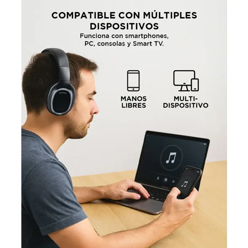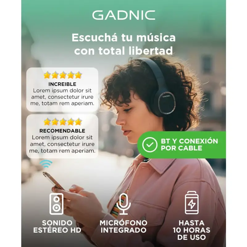 Acerca de Auriculares Inalámbricos Gadnic Vincha Bluetooth 5.0 Sumergíte en una experiencia auditiva excepcional con nuestros auriculares tipo vincha de última generación. Gracias a la avanzada tecnología Bluetooth 5.3, disfrutarás de una conexión inalámbrica estable y eficiente con tus dispositivos, con un alcance de hasta 10 metros. Olvídate de los molestos cables y disfruta de la libertad de movimiento. Nuestros auriculares están equipados con potentes altavoces de 40 mm que ofrecen una calidad de sonido excepcional. Con una batería de 300 mAh, estos auriculares te brindan más de 10 horas de tiempo de juego o conversación con una sola carga. Ya sea en un largo viaje, durante tus jornadas de trabajo o en tus sesiones de entrenamiento, estos auriculares no te defraudarán. La diadema ajustable se adapta a tu cabeza, y las almohadillas suaves permiten un uso prolongado sin molestias. Además, su diseño plegable facilita su transporte y almacenamiento. Además de la conectividad Bluetooth, estos auriculares también ofrecen un puerto de entrada de audio de 3.5 mm. Esto significa que puedes usarlos con una amplia variedad de dispositivos, desde teléfonos y tabletas hasta computadoras y equipos de audio. Con su calidad de sonido excepcional, conectividad avanzada y comodidad duradera, te permitirán disfrutar al máximo de tu música y estar siempre listo para tus llamadas. Especificaciones Versión: V5.3 Perfil: HSP/HFP/A2DP/AVRCP Alcance: =10m Frecuencia: 20 Hz ~ 20 kHz Tamaño del altavoz: 40 mm Sensibilidad: 109±3dB Impedancia: 32? Entrada de audio: puerto de entrada de audio de 3,5 mm Entrada de carga: Micro-USB Batería: 300 mAh Voltaje de carga: 5V Tiempo de carga: 2 horas Tiempo de juego: &ge 10 horas Tiempo de conversación: &ge 10 horas