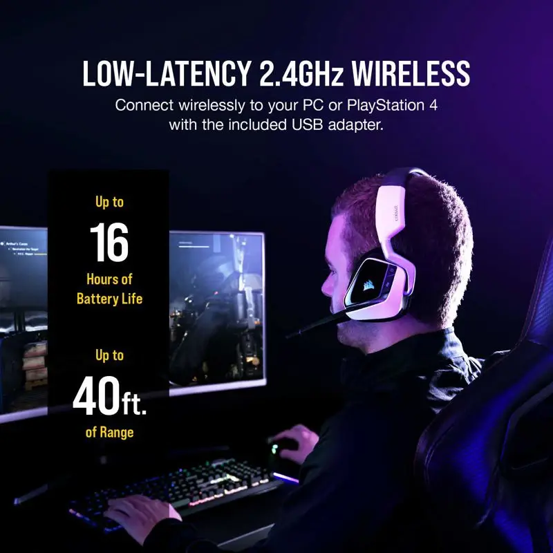 Sumérjase en la acción con el sistema inalámbrico Corsair void RGB Elite, con controladores de audio de neodimio de 50 mm ajustados a medida que ofrecen un sonido envolvente 7.1 en el PC El tejido de malla de microfibra y las almohadillas de espuma viscoelástica brindan una comodidad duradera Conéctese a su PC o PS4 con una conexión inalámbrica de 2,4 GHz de baja latencia con un alcance de hasta 40 pies y una duración de la batería durante todo el día de hasta 16 horas Un micrófono omnidireccional con indicador de silencio LED garantiza que se escuche con una claridad vocal excepcional El vacío El diseño distintivo y la construcción duradera de RGB Elite se complementan completamente iluminación RGB personalizable en cada auricular El potente software Corsair iCUE lo une todo y permite un control total de los ajustes del ecualizador e iluminación RGB con sonido envolvente 7.1.
