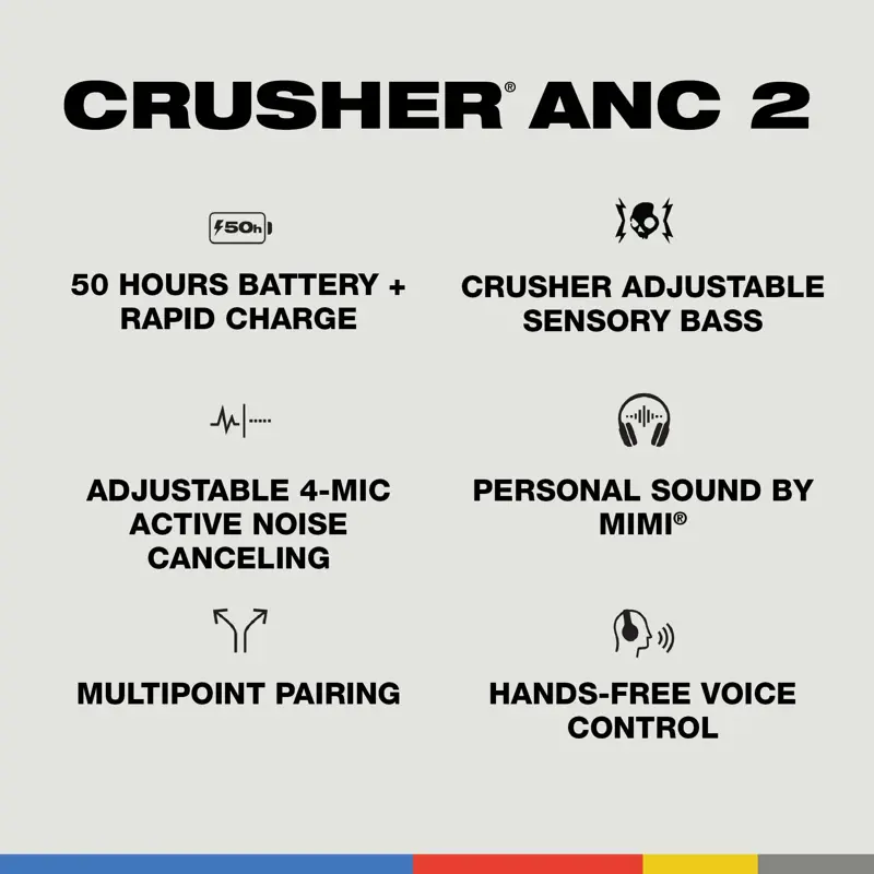Experimenta la música y las películas como nunca antes con los auriculares inalámbricos Skullcandy Crusher ANC 2 over-ear. Con la tecnología patentada Multi-Sensory Crusher Bass, estos auriculares combinan dos drivers de rango completo de 40 mm con dos drivers adicionales de graves para ofrecer una experiencia de bajos rica y profunda que puedes sentir físicamente, dando vida a tu audio con un sonido envolvente. Ya sea que disfrutes de tu lista de reproducción favorita o veas una película, la respuesta de graves mejora cada ritmo y efecto de sonido.