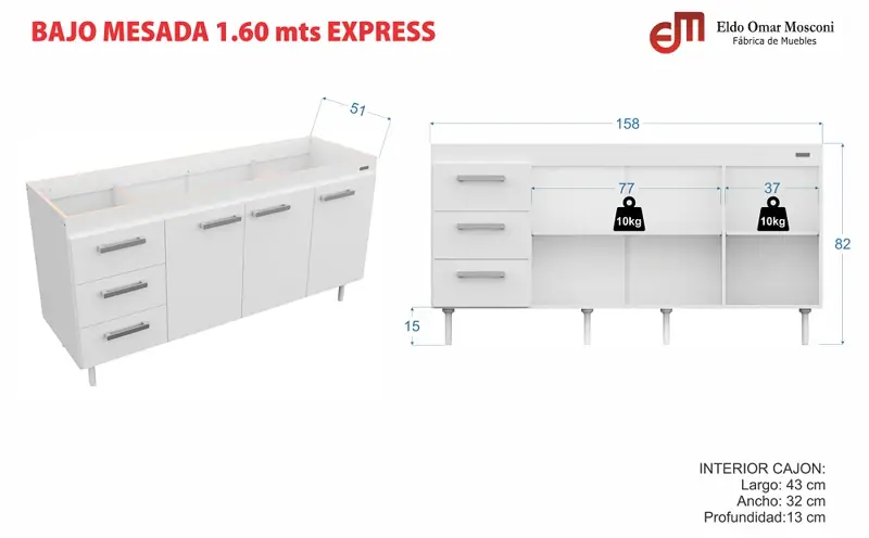 BAJO MESADA EXPRESS 1,60 mts. SIN BACHA ESPECIFICACIONES: