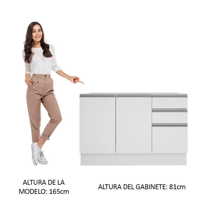 Este diseño cuenta con los espacios ideales para optimizar tu cocina, el espacio para colocar una Bacha de Acero Inoxidable o de piedra es de 120 cm de x 52 cm. (No incluye la Bacha ni la Mesada). Las patas son de PVC con regulación de altura, y zócalo removible de MDP.