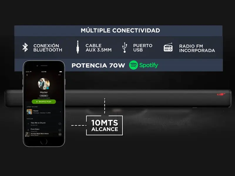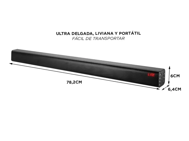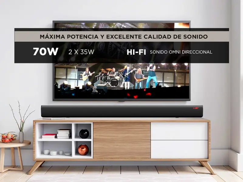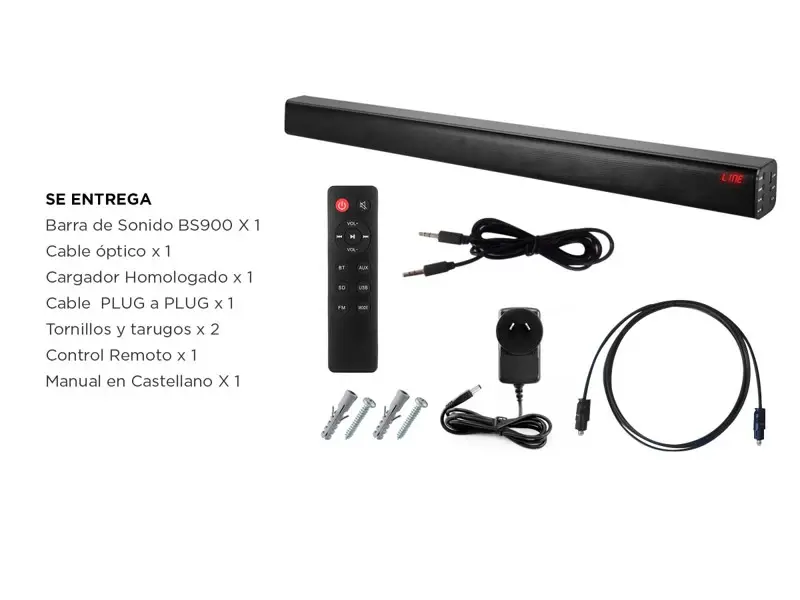 Disfruta tus tus partidos, series, películas, canciones favoritas con la Barra de Sonido BS900. Posee Bluetooth con un alcance de hasta 10 metros para que escuches lo que quieras desde tus dispositivos o desde la TV. Posee una Potencia de 70 Watts. Reproduce música des tu dispositivo con la función USB o con su entrada Auxiliar de 3.5mm. Entrada para cable optical (Cable incluido) Controla las funciones de reproducción Play, Volumen y Skip. Ademas podrás controlar la barra de sonido con el control remoto que viene incluido o con el celular. ¡Mejorá el sonido de tu TV! El complemento perfecto para tu TVque mejora el sonido. Disfruta de un sonido espectacular y potente con este compacto Soundbar.
