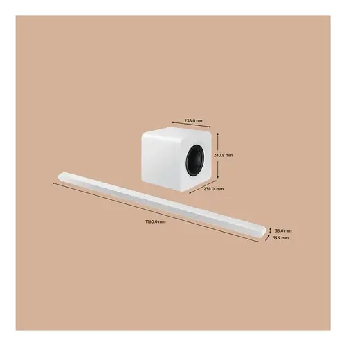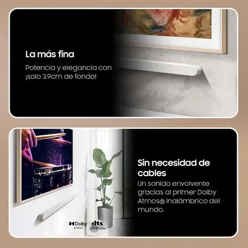 Especificaciones Número de canales 3.1.2 Dimensiones brutas (An x Al x Prof): Un paquete 1232.0 x 371.0 x 294.0 mm Peso bruto (Un paquete) 11.0 kg Consumo en Funcionamiento (Barra) 28 W Detalle de especificaciones Características generales Número de canales 3.1.2 Número de altavoces 10 Color Blanco Altavoz Altavoz central Sí Altavoz superior Sí Altavoz frontal de rango amplio No Altavoz lateral No Subwoofer Inalámbrico incluido Sí Altavoz inalámbrico trasero incluido No Características de audio Amplificador de voz activo Sí SpaceFit Sound Sí Dolby ATMOS Music, ATMOS, Dolby 5.1ch, Dolby Digital Plus, Dolby True HD Modo mejora de voz Sí Modo nocturno Sí Modos de sonido Surround Sound expansión, Juego Pro, Estándar, Adaptativo, Sound DTS Virtual:X LPCM Multi canal Características de vídeo 4K Video Pass No HDR No disponible Formato decodificador Formato decodificador MP3, AAC, OGG, FLAC, WAV, ALAC, AIFF Conectividad Entrada HDMI No Salida HDMI 1 HDMI ARC Sí (eARC) HDMI CEC Sí Entrada Optical 0 Bluetooth Sí Wi-Fi Sí USB Music Playback No One Remote Control Sí Versión Bluetooth 5.2 Características especiales SmartThings App Sí Q-Symphony Sí Altavoz trasero multiposición No Tap Sound Sí Chromecast Sí Spotify(Hi-Fi) Connect Sí AirPlay Sí Dolby ATMOS inalámbrico Sí Roon Service No Características de voz Funciona con Google Sí Bixby No Alexa Sí (Integrado) Dimensiones Dimensiones netas (Altavoz principal) (AnxAlxGr) 1160.0 x 38.0 x 39.9 mm Dimensiones netas (Módulo inalámbrico) (AnxAlxGr) No disponible Dimensiones netas (Altavoz trasero) (AnxAlxGr) No disponible Dimensiones netas (Sub Woofer) (AnxAlxGr) 238.0 x 240.8 x 238.0 mm Dimensiones brutas (WxHxD): Un paquete 1232.0 x 371.0 x 294.0 mm Peso Peso neto (altavoz principal) 1.4 kg Peso neto (Módulo inalámbrico) No disponible Peso neto (altavoz) No disponible Peso neto (Subwoofer) 6.4 kg Peso bruto (Un paquete) 11.0 kg Consumo de energía Consumo en Stand-by (Barra) 0.5 W Consumo en Stand-by (Trasero) No disponible Consumo en Stand-by (Subwoofer) 0.5 W Consumo en Funcionamiento (Barra) 28 W Consumo en Funcionamento (Trasero) No disponible Consumo en Funcionamento (Subwoofer) 26 W Free Voltage Sí Eficiencia Energética Sí Accesorios compatibles Mando a distancia Sí Soporte de pared Sí Actualización de software Período de actualización de seguridad (al menos 5 años) No disponible