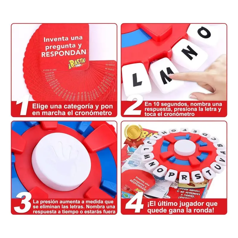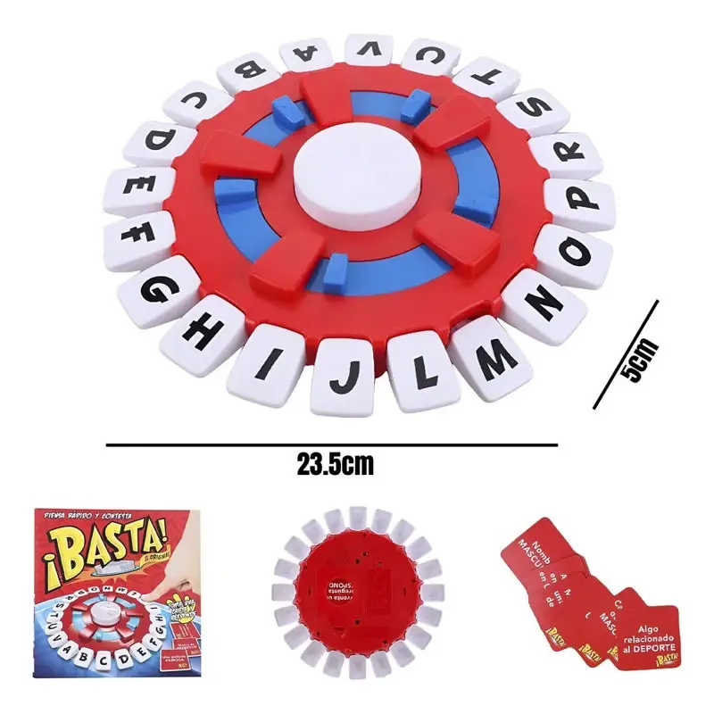 Basta! es un juego de cartas que desafía tu agilidad mental y rapidez en las respuestas. Diseñado para un grupo de 2 a 8 jugadores, es ideal para reuniones con amigos o familiares, donde la diversión y la competencia se entrelazan en un ambiente dinámico. A partir de los 12 años, este juego promete momentos emocionantes y risas aseguradas.El formato físico incluye cartas y un tablero, facilitando la interacción entre los participantes. Con componentes de plástico, su durabilidad y calidad aseguran que cada partida sea memorable. La experiencia se enriquece con un sistema de sonido que añade un toque de emoción al desarrollo del juego.Proporciona horas de entretenimiento al impulsar la destreza y la creatividad de los jugadores. Compatible con sesiones rápidas o largas, cada ronda es una oportunidad para desafiar a tus amigos y demostrar quién tiene el pensamiento más ágil. Con Basta!, cada partida se convierte en una vivencia única y divertida que unirá a los participantes a través del ingenio y la estrategia.