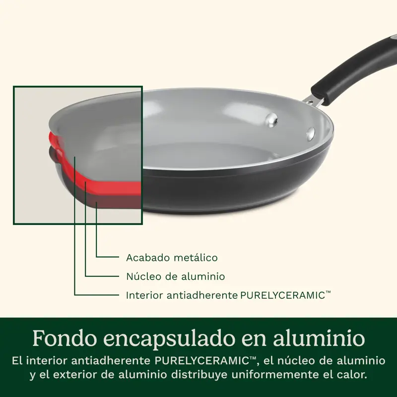 • Mangos de silicona remachados para mayor resistencia y durabilidad, contorneados para un agarre seguro y diseñados para mantenerse fríos en la estufa.