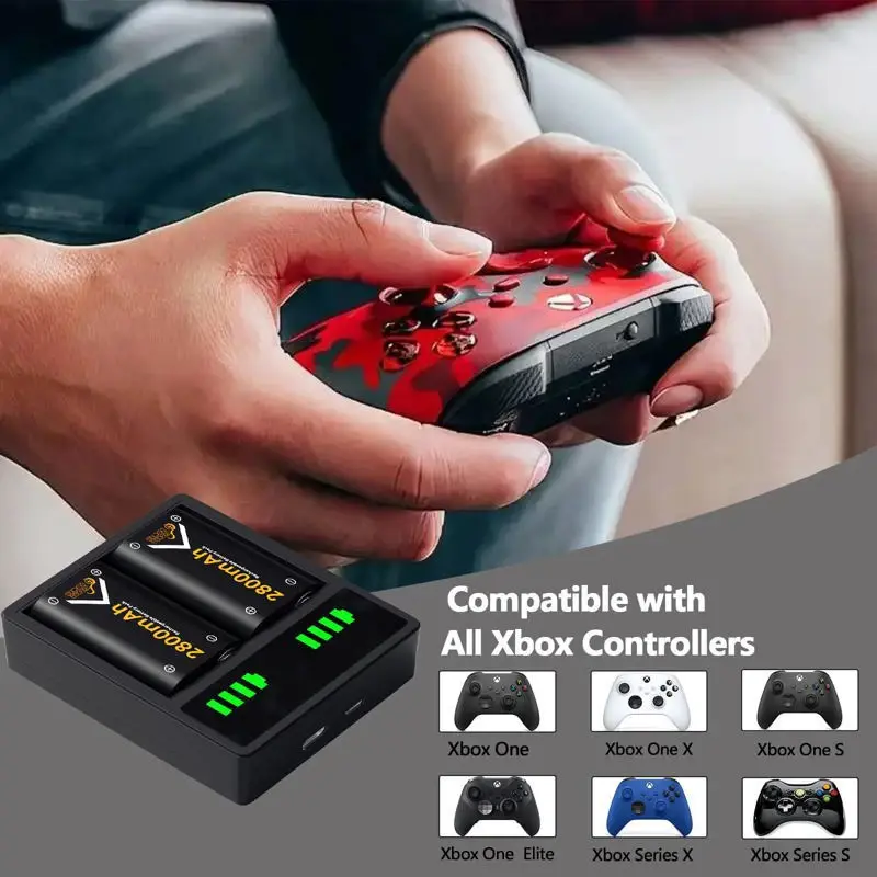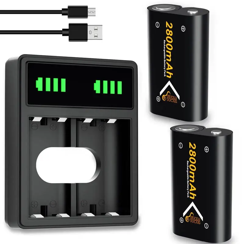 - ?Garantía de seguridad?El paquete de baterías recargables de Xbox cuenta con cuatro capas de protección (sobrecarga, cortocircuito, alta temperatura y protección contra sobretensiones) con una construcción resistente al fuego de alta calidad? ?Paquete incluido?2 paquetes de baterías recargables de 2800 mAh para Xbox One/Xbox Series X/S, 1 estación de carga de baterías Xbox, 1 cable USB.