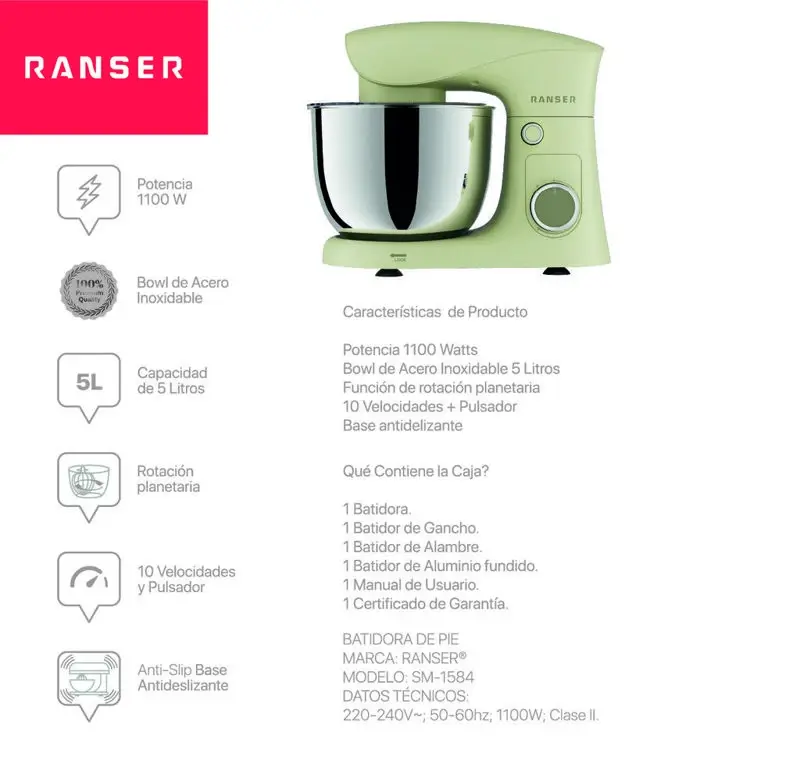 La batidora planetaria Ranser Cuomo SM-1584 combina potencia, estabilidad y capacidad para adaptarse a una amplia variedad de preparaciones domésticas. Equipada con un motor de 1100 W y un bowl de acero inoxidable de 5 litros, permite trabajar grandes cantidades de mezcla con resultados homogéneos. Su sistema de rotación planetaria optimiza el contacto con todos los ingredientes, logrando texturas uniformes en menos tiempo.
