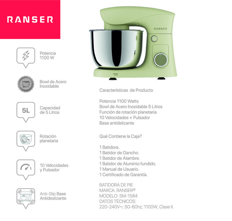 La batidora planetaria Ranser Cuomo SM-1584 combina potencia, estabilidad y capacidad para adaptarse a una amplia variedad de preparaciones domésticas. Equipada con un motor de 1100 W y un bowl de acero inoxidable de 5 litros, permite trabajar grandes cantidades de mezcla con resultados homogéneos. Su sistema de rotación planetaria optimiza el contacto con todos los ingredientes, logrando texturas uniformes en menos tiempo.