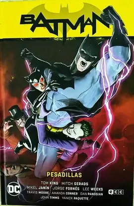 Batman se encuentra atrapado en un ciclo de locura, sueños y pesadillas. Mientras sus enemigos toman posiciones en Gotham City, el Caballero Oscuro vive en una realidad propia repleta de situaciones conocidas que incluyen enfrentarse a villanos como el Profesor Pyg... y también de otras que parecen propias de un mundo paralelo donde la situación con Catwoman es muy diferente. ¿Logrará escapar de este bucle? El guionista Tom King hizo una pausa en la trepidante trama de Batman para jugar con situaciones que parecían imposibles para el Caballero Oscuro. Pesadillas es una oportunidad única de sumirse en la mente de este héroe, que divaga entre persecuciones por callejones oscuros y momentos felices como su despedida de soltero (y la de Selina). Con la aparición especial de Superman, Lois Lane y John Constantine, este volumen cuenta con el dibujo de autores de primera fila como Mitch Gerads, Mikel Janín, Jorge Fornés, Yanick Paquette o Amanda Conner.