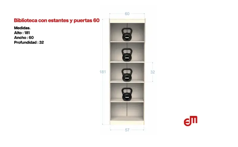 BIBLIOTECA CON ESTANTES Y PUERTAS ESPECIFICACIONES:* Colores: Tabaco- Wengue- Blanco- Venezia- Avellana* Medidas: 60x29x181 cm.* Material: melamina sobre MDP 15 mm.* 2 estantes fijos y 2 estantes de altura regulable.* 2 puertas con bisagras metálicas.* Manijas plásticas color gris.* Marca: MosconiPACKAGING: 1 BULTO Medidas: 183x32x10 cm.- Peso: 34 kg.