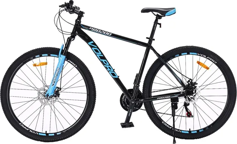 BICICLETA PRO200 RODADO 29 TALLE 20 VOLPRO CUADRO: Acero de 29", pintado, pegatinainterior HORQUILLA: Suspensi¦nn de acero, spray, pegatina exterior (sin bloqueo de horquilla), horquilla de colores CADENA: Cadena de 1/2" x 3/32" x 110L LLANTA: Acero de 29" x 1.75 x 32H, llanta de doble pared FRENO: Freno de disco CUBIERTA: 29" x 2.1 PALANCA DE CAMBIO: Shimano EF41 DESVIADOR: Marca china PINONES: 1/2" x 3/32" x 13-28T, 7 velocidades, posicionamiento BIELAS: Marca china, acero, con bielas de acero BUJES: Delantero y trasero, de acero con cierre r¦¡pido PEDAL: Pl¦¡stico ASIENTO: 3 colores (base negra con trimen celeste y blanco) Color negro, azul y blanco garantia 6 meses Origen China