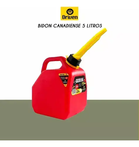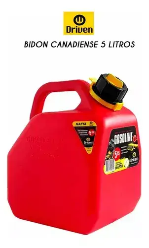 Bidón canadiense de 5 litros homologado para combustible y totalmente hermético. Ideal y práctico para llevar a todos lados en auto, lancha, 4x4 y más! Apto para todo tipo de combustible: nafta, gasoil y diesel. El bidón contiene en su interior un pico vertedor a 45° con sistema anti venteo, esto permite que el combustible salga de manera fluida por el mismo. Incluye traba de seguridad.