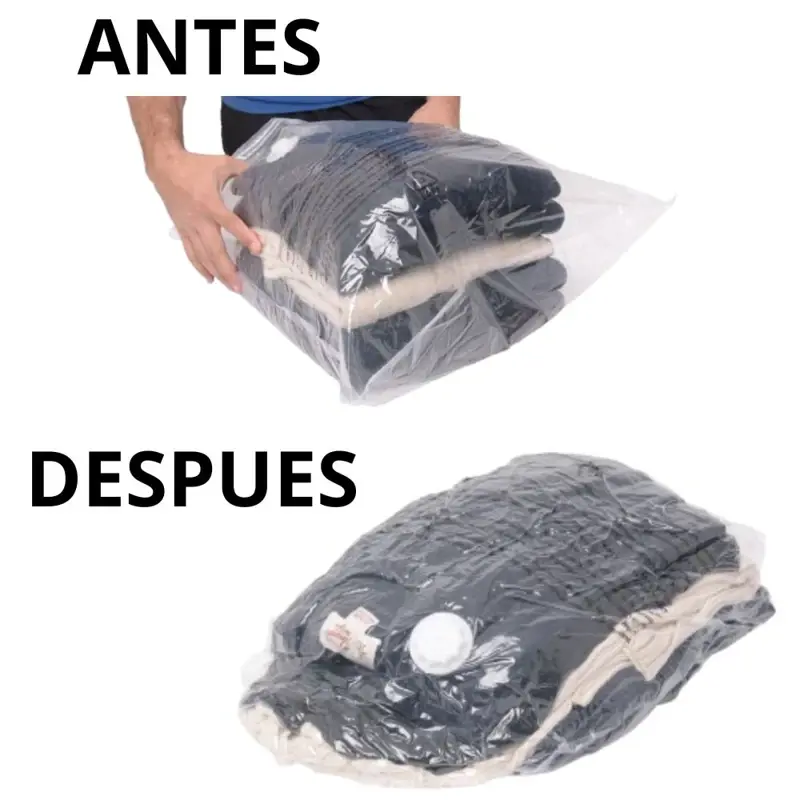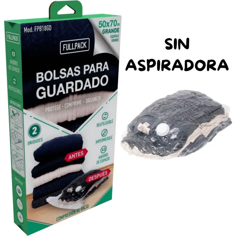 Set x 2 Bolsas con valvula de vacio tamaño Grande (quipaje Mediano / Grande)Medidas: 50 x 70 cmMarca: FullpackOrigen: China- VALVULA DE VACIO, NO REQUIERE ASPIRADORA- Protege, comprime, organiza- Ahorra espacio- Doble cierre hermético- Impermeable- Reutilizable- Protección contra Polillas, Polvo, humedad y Olores- Sirve para usar en equipaje Mediano / Grande- Ideal para optimizar y ahorrar espacios de guardado en viajes y el hogar.-Tamaño ideal para el placard para el guardado de prendas medianas, camperas abrigadas y cubrecama de plaza y media.Consulta por otros tamaños:- Chica (30x50cm)- Jumbo (80x100cm)