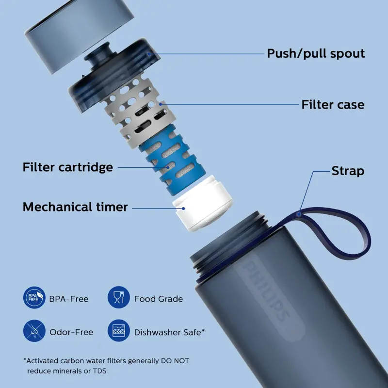 - ? &: Mejora al instante el sabor del agua al reducir el cloro y las partículas (sabor y olor). Disfrute de agua potable más limpia y con un sabor más fresco. (*Los filtros de agua con carbón activado no suelen reducir los minerales ni el TDS) ? La botella ligera de agua potable está hecha de plástico apto para uso alimentario y no contiene sustancias químicas nocivas como el BPA. Puedes elegir entre el filtro de actividad física y el filtro de aventura en función de los escenarios de uso aplicables.