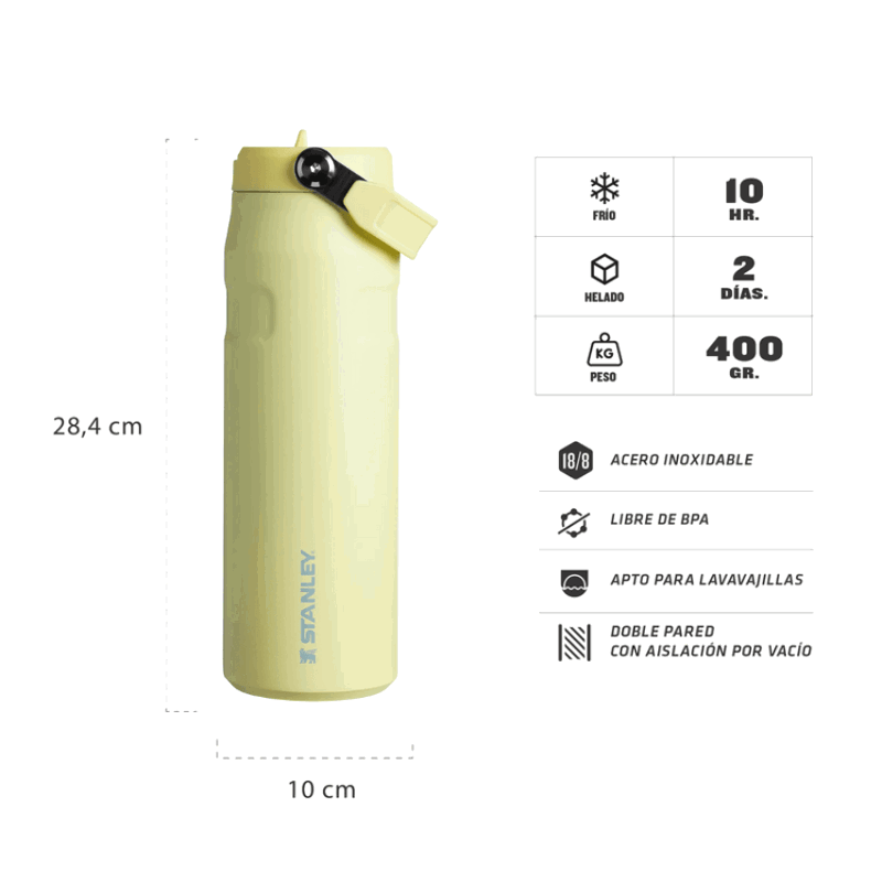 Hidratación de otro nivel. La botella IceFlow Flip Straw 2.0 de 710ml cuenta con la tecnología premium AeroLight™, que la hace un 33% más ligera que las botellas estándar de acero inoxidable. Su aislamiento de acero ultraligero mantiene tu agua helada durante horas. El asa plegable la convierte en la compañera perfecta. La tapa Flip Straw 2.0 tiene una abertura más grande para beber y una pajilla integrada, lo que te permite hidratarte más rápido. Ábrela para beber, ciérrala de un clic y guarda la botella en tu bolso o portavasos del coche. Incluso puedes quitar el nuevo pico para una limpieza más profunda.- 10 Hs Frío.- 2 Días Helado.