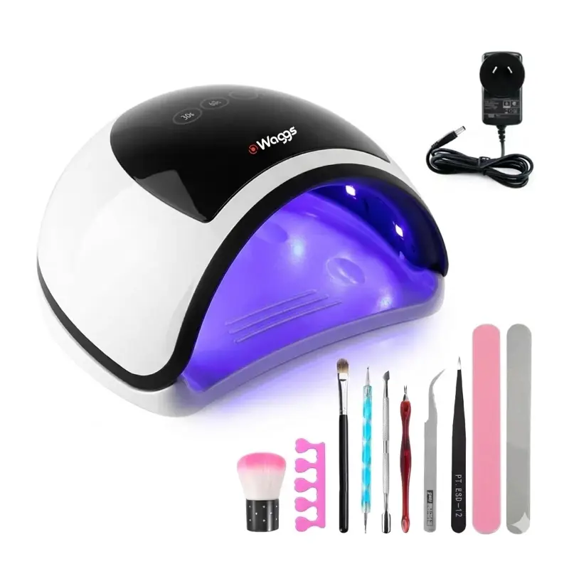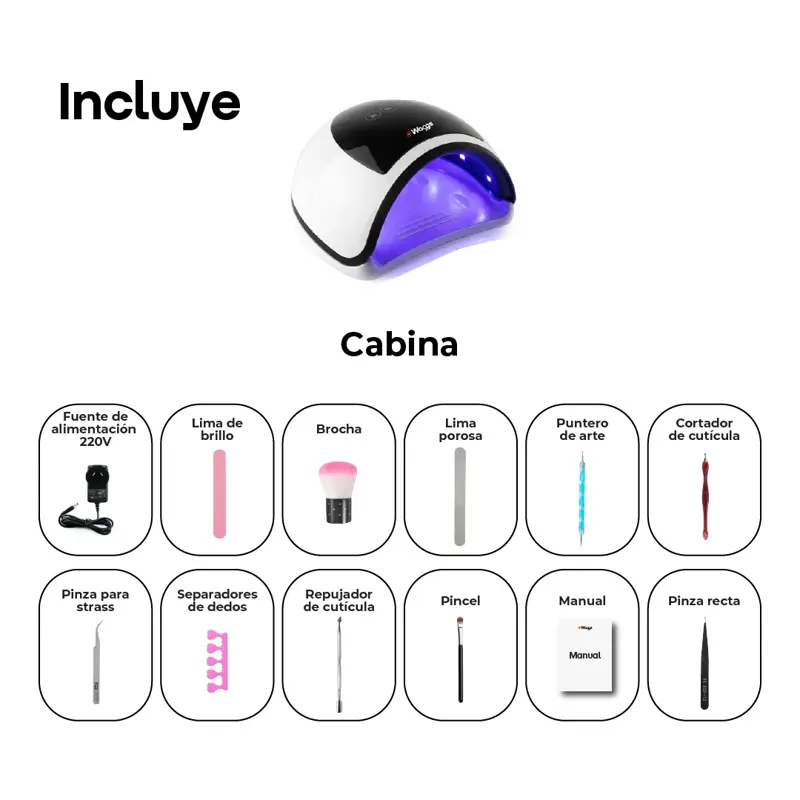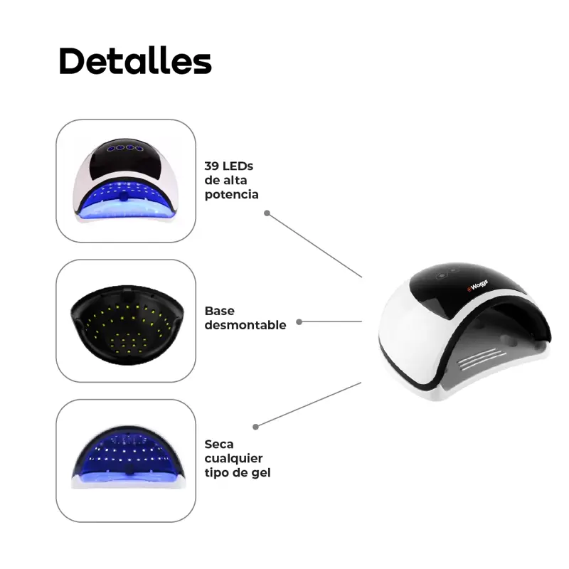 La lámpara UV WAGGS CABU01 garantiza un secado profesional, rápido y uniforme gracias a sus 39 LEDs de alta potencia (equivalente a 96W) estratégicamente distribuidos. Diseñada para manos y pies, incorpora sensor de proximidad para encendido automático, base imantada removible para mayor comodidad y una pantalla LCD táctil que permite seleccionar entre 30, 60, 90 y 120 segundos según el tratamiento. Sus medidas son 22.5 x 20.5 x 12 cm, con un peso de 795 g. Incluye fuente de alimentación de 220V, manual en español y kit de accesorios. Ideal para quienes buscan resultados rápidos, seguros y de calidad profesional.