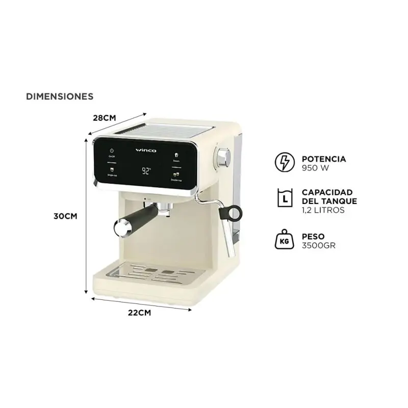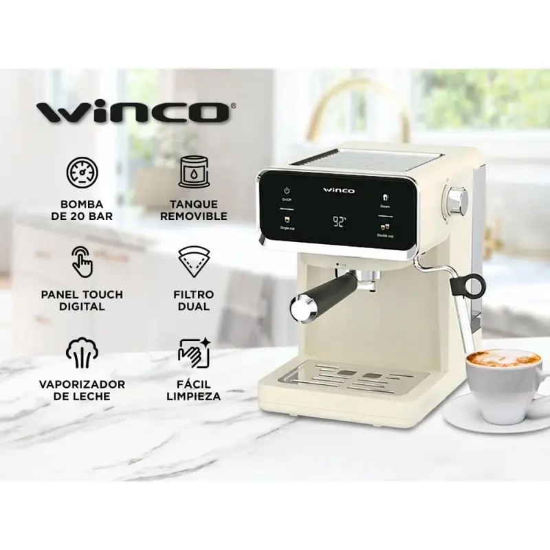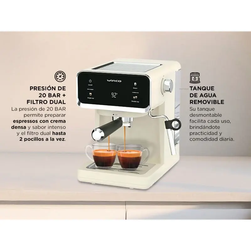 Descubrí la experiencia de un café profesional en la comodidad de tu hogar con la cafetera express Winco W1927B. Su potente bomba de 20 BAR garantiza una extracción óptima, logrando espressos con cuerpo y sabor inigualable. El panel touch digital te permite controlar todas las funciones de manera sencilla, mientras que el visor de temperatura te asegura la precisión en cada preparación. Su vaporizador de leche incorporado es ideal para crear cappuccinos y lattes con espuma perfecta. Además, el tanque de agua removible facilita la recarga y limpieza. Con un diseño moderno y compacto, la Winco W1927B se adapta a cualquier espacio, brindándote calidad y estilo. Especificaciones Voltaje: 220 V Potencia: 950 W Capacidad del Tanque de Agua: 1,2 Litros Tanque de Agua Removible Bomba: De 20 BAR Panel Touch Digital Vaporizador de Leche Integrado Filtro Dual: Para 1 o 2 pocillos Diseño Moderno Visor de Temperatura Fácil Limpieza Garantía: 12 meses