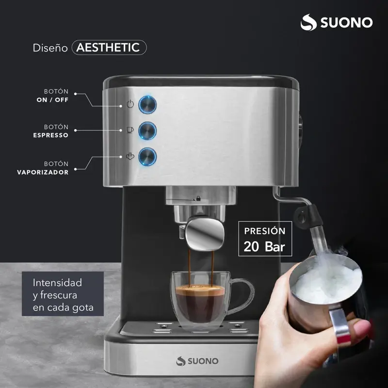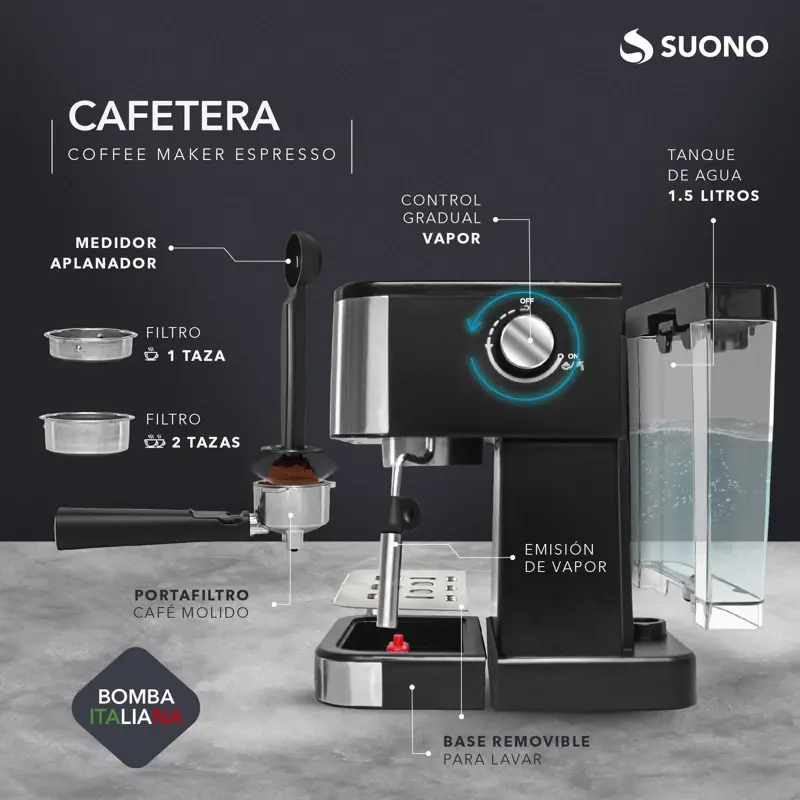 Cafetera Expresso Suono 1.5 L. Calidad y Elegancia para tu Café Perfecto