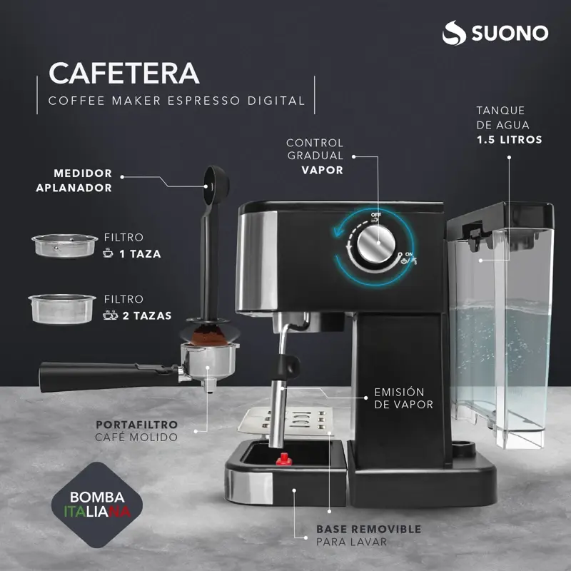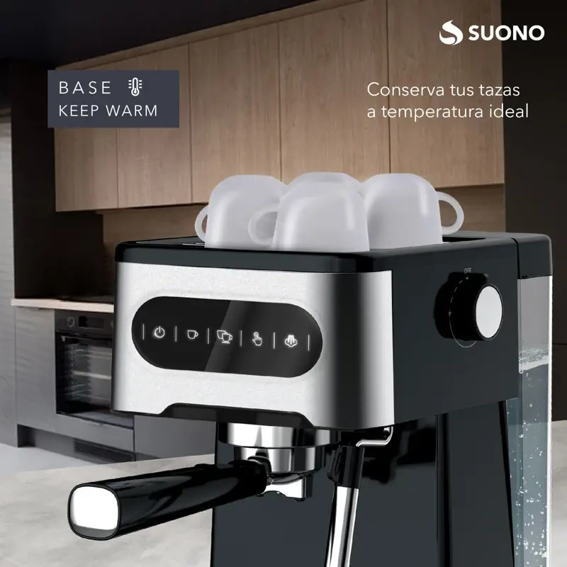 La cafetera expreso automática de 1.5 litros de Suono es la aliada perfecta para los amantes del café que buscan la combinación ideal entre comodidad y calidad.