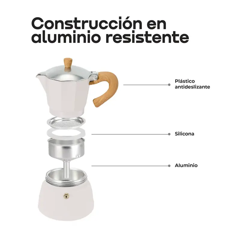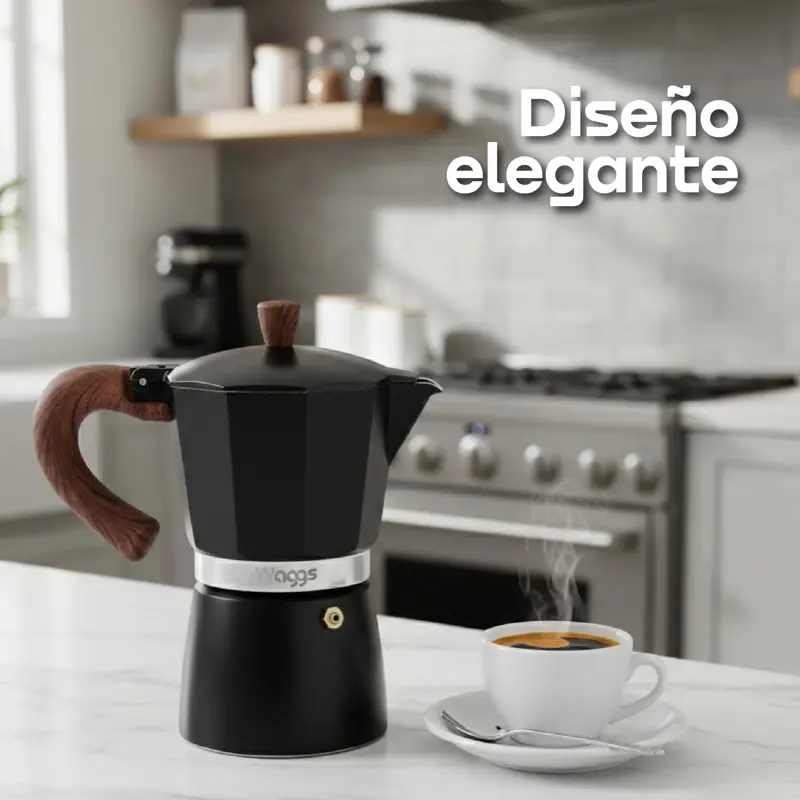 Cafetera italiana WAGGS de aluminio, con diseño clásico inspirado en la auténtica moka italiana. Permite preparar hasta 6 tazas (300 ml) con una extracción intensa y equilibrada, resaltando el sabor y aroma del café. Fabricada en aluminio pulido con mango de madera ergonómico y resistente al calor, es compatible con cocinas a gas, eléctricas y vitrocerámicas (no apta para inducción). Incorpora válvula de seguridad para mayor confiabilidad. Dimensiones: 19 × 17,5 × 9 cm, peso aprox. 500 g. Disponible en color negro/crema. Incluye cafetera italiana WAGGS.