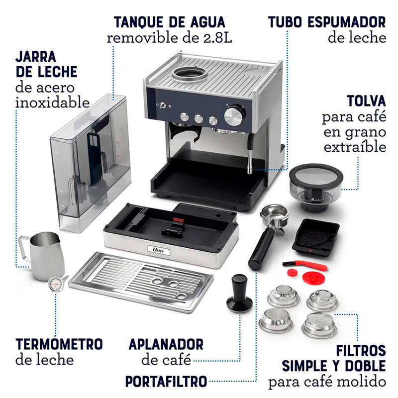 Porta filtro, apisonador, jarra para leche, termómetro para leche, filtros sencillos y presurizados de 1 y 2 tazas, cepillo y pin de limpieza