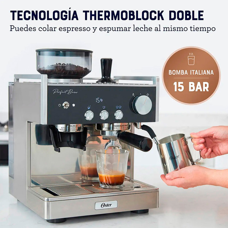 La Cafetera para espresso Oster Perfect Brew Máxima de 15 bares con molino integrado y con Tecnología Thermoblock brinda una óptima extracción del agua para obtener un espresso con un sabor consistente y más rico.