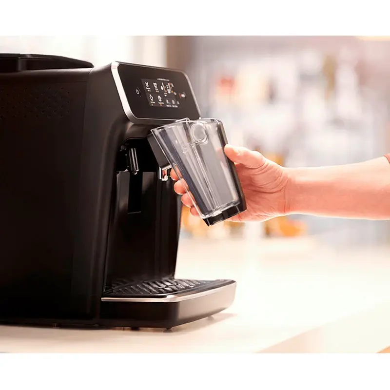 2 cafés deliciosos hechos con granos frescos, con facilidad Gracias a la pantalla táctil intuitiva Disfrute el sabor y aroma deliciosos del café hecho con granos frescos a la temperatura perfecta, gracias a nuestro sistema de preparación inteligente. El espumador de leche clásico le permite crear un cappuccino o latte macchiato suave como la seda fácilmente. Espumador de leche clásico El espumador de leche clásico dispensa vapor, lo que le permite preparar fácilmente una espuma de leche suave y sedosa para su capuchino. ¿Qué más ofrece? Con solo dos piezas, el espumador de leche clásico también es fácil de limpiar. Alarma automática de eliminación de los depósitos de sarro Es fácil de limpiar y mantener su cafetera con el programa automático que notifica cuando tiene que eliminar el sarro. Puede ajustar la frecuencia de este procedimiento para que coincida con la dureza del agua en el hogar. Sistema de preparación desmontable El sistema de preparación es el centro de cada máquina de café completamente automática y debe limpiarse con regularidad. El sistema de preparación desmontable le permite realizar una limpieza profunda con solo enjuagarlo bajo el grifo. Garantia de 2 años
