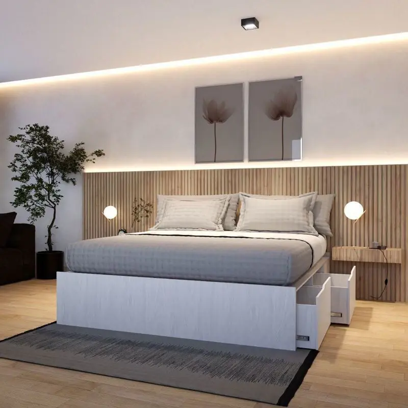 La Cama EcoBox tiene un diseño extensible que permite variar su ancho desde 90 hasta 200 cm, brindando flexibilidad para cualquier espacio. Esto significa que el producto cuenta con distintas perforaciones, adaptándose a distintas medidas de colchones (90, 140, 160, 180, 200 cm x 200 cm de largo). Con sus 4 cajones amplios, podrás mantener tu habitación siempre organizada. Equipados con correderas telescópicas de extensión completa, el cajón se desliza suavemente y permite su apertura al 100%, maximizando el espacio útil y la visibilidad interior¡Estética, funcionalidad y versatilidad en un solo mueble!
