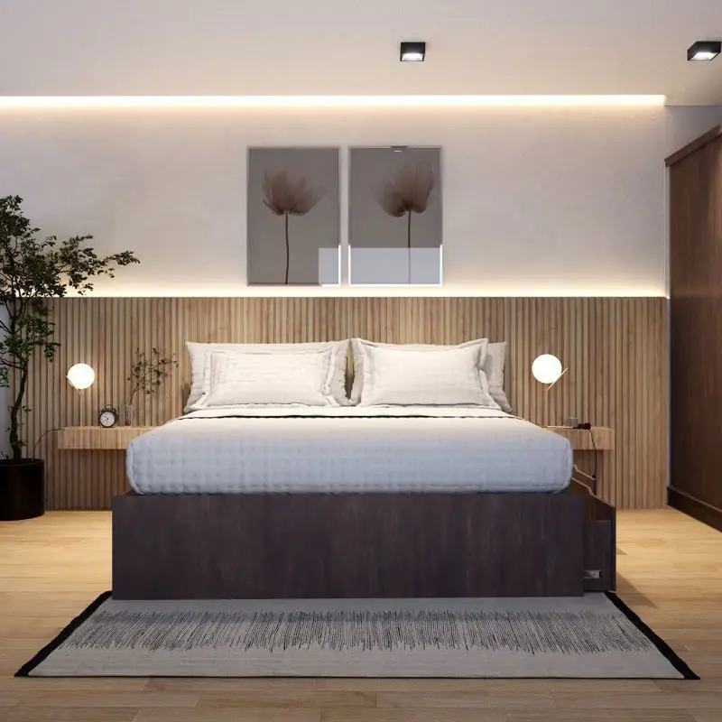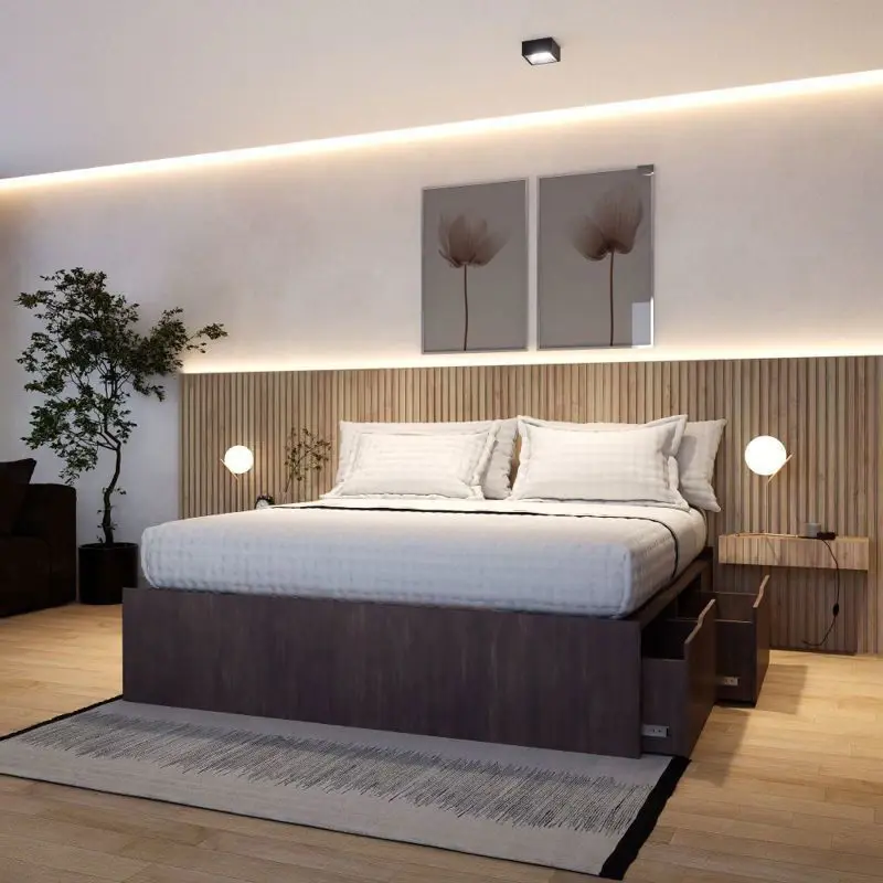 La Cama EcoBox tiene un diseño extensible que permite variar su ancho desde 90 hasta 200 cm, brindando flexibilidad para cualquier espacio. Esto significa que el producto cuenta con distintas perforaciones, adaptándose a distintas medidas de colchones (90, 140, 160, 180, 200 cm x 200 cm de largo). Con sus 4 cajones amplios, podrás mantener tu habitación siempre organizada. Equipados con correderas telescópicas de extensión completa, el cajón se desliza suavemente y permite su apertura al 100%, maximizando el espacio útil y la visibilidad interior¡Estética, funcionalidad y versatilidad en un solo mueble!