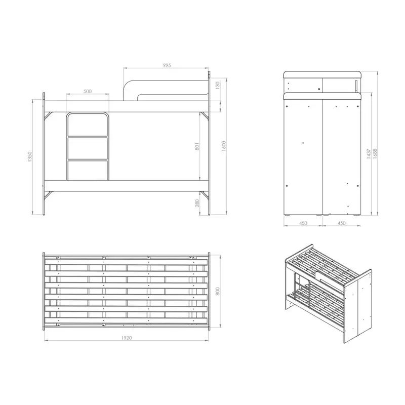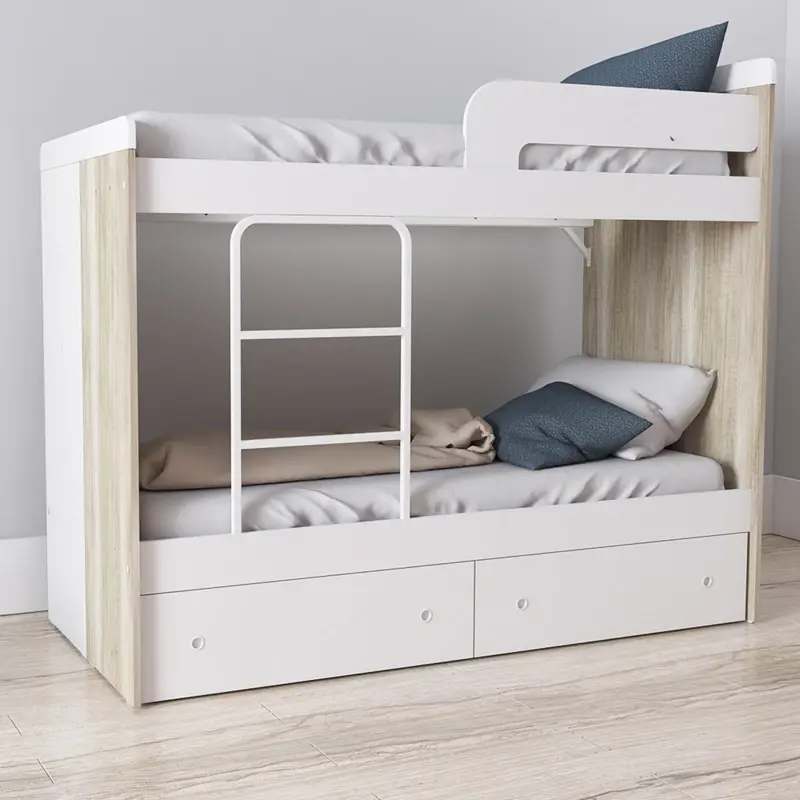 Cama Cucheta con Escalera Integrada. Armado Reversible. Barandas y Detalles Laqueados. Espacio de Guardado en Escalera con Puertas de Abrir. Opcional Carrocama o Cajones adicionales. Fabricado en MDP con Melamina Texturada. Largueros y Refuerzos Metálicos para garantizar la resistencia. Soporta hasta 120 kg estáticos por cama. Para colchones de 80 cm. 201 cm de Largo Total.