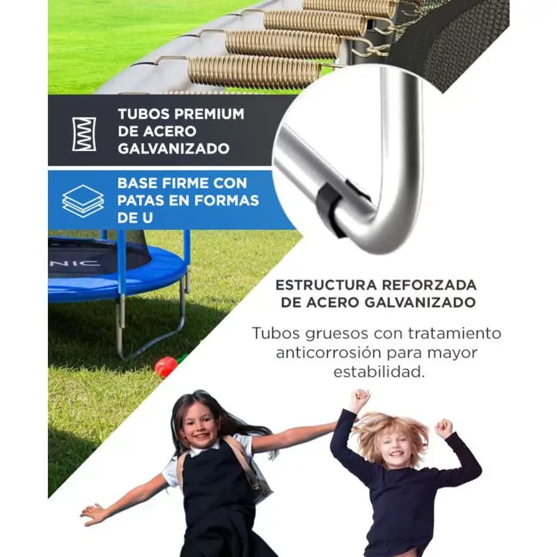 Lona de salto UV-resistant + muelles de acero para mayor elasticidad.