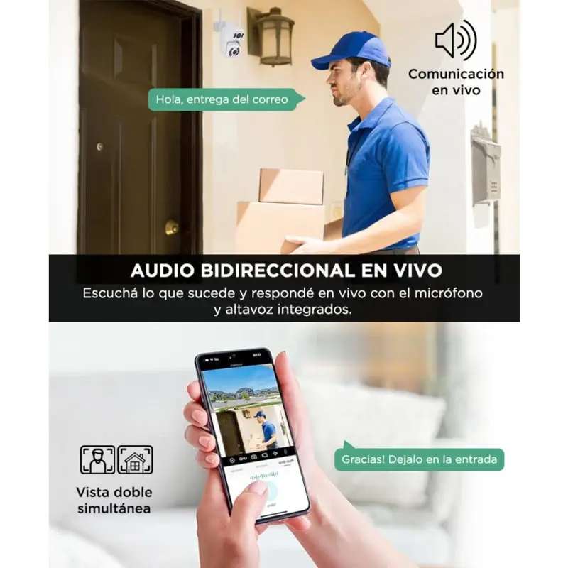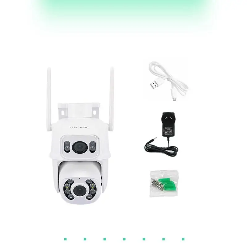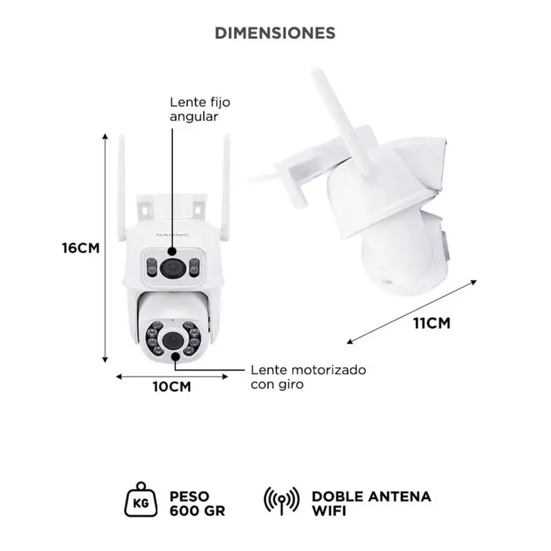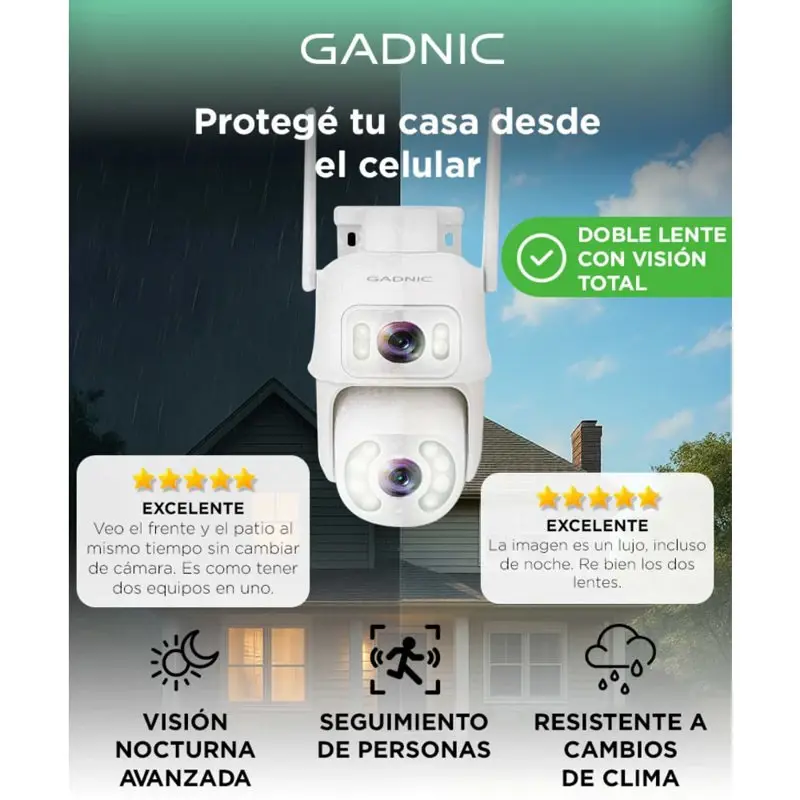 Acerca de Cámara de Seguridad Gadnic Doble Lente 4k 8MP Transforma la seguridad de tu hogar o negocio con nuestra avanzada Cámara de Seguridad. La Detección de Forma Humana y la función de Seguimiento y Captura garantizan que no pase desapercibido ningún movimiento sospechoso. La Cámara también cuenta con Audio Bidireccional, lo que te permite comunicarte de forma remota con quienes están cerca de la cámara. Con la capacidad de Monitoreo a través de teléfonos móviles, puedes acceder y controlar la cámara desde dispositivos iOS y Android en cualquier momento y lugar. Las Notificaciones en tiempo real te mantienen al tanto de lo que sucede en tu propiedad, y el Almacenamiento en la Nube garantiza que tus grabaciones estén seguras. La Cámara de Seguridad incorpora una potente fuente de luz compuesta por 8 infrarrojos y 8 luces blancas. Puede alternar entre el Modo de Luz de Estrellas a Todo Color, la Visión Nocturna por Infrarrojos y la Advertencia de Luz Dual, lo que garantiza imágenes claras y detalladas en todas las condiciones de iluminación. Este dispositivo funciona con una potencia de 10W y es capaz de operar en un amplio rango de temperaturas, desde 10 °C hasta 60 °C, con una humedad inferior al 90%. Su fuente de alimentación de CC 12 V ± 10 % garantiza un funcionamiento confiable y estable. No comprometas la seguridad de lo que más valoras. Nuestra Cámara de Seguridad combina tecnología de vanguardia con una resistente construcción para brindarte la tranquilidad que necesitas. Especificaciones Detección de forma humana: Si Seguimiento y captura: Si Audio bidireccional: Sí Monitoreo de teléfonos móviles (iOS, android): Si Notificaciones: Si Almacenamiento en la nube: Sí Fuente de luz: 8 infrarrojos + 8 luces blancas Modo de luz: luz de estrellas a todo color/visión nocturna por infrarrojos/advertencia de luz dual Conexión de red cableada e inalámbrica: Si Tecnología avanzada de compresión de vídeo H.265AI: Si Protección contra rayos: Si Control maestro: DSP de doble núcleo de 32 bits (XM650V200) Sensor: Dos sensores CMOS de alto rendimiento de 2 millones de 1/2,8” 300AI Iluminación mínima: Color: 0,01 Lux (F1.2,AGC ON); 0 Lux con IR? Blanco y negro: 0,001 Lux (F1.2,AGC ON),0 Lux con IR Distancia focal: F1.4*3.6MM+F1.4*6MM Resolución principal: 2304*2592 Velocidad de fotogramas: 12 fps Interfaz de almacenamiento: tarjeta TF local (hasta 256G) Rango de frecuencia: 2,4 GHz ~ 2,4835 GHz Potencia: 10W Temperatura: 10 C