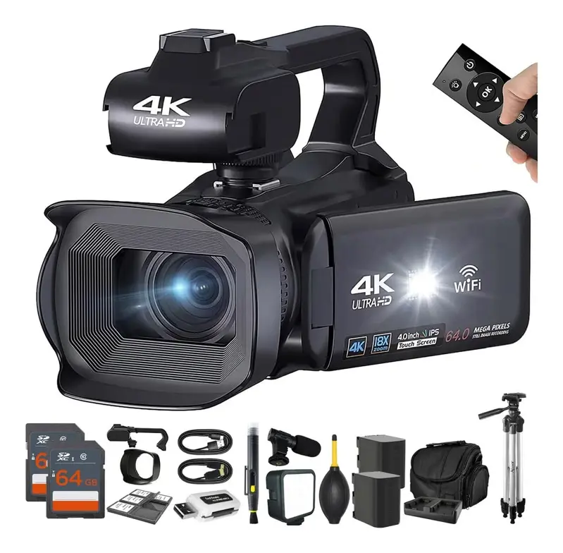 Cámara de video 4K 64MP Videocámara Vlogging Cámara para YouTube 60FPS 18X Zoom Videocámara, WiFi, cámara web, micrófono externo, 2 tarjetas SD de 64 GB, trípode de 50 pulgadas, funda, lector